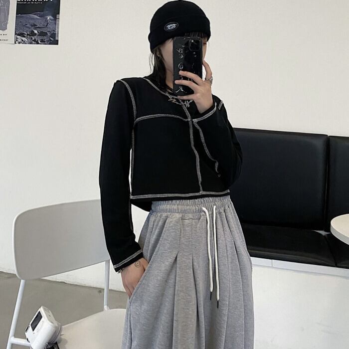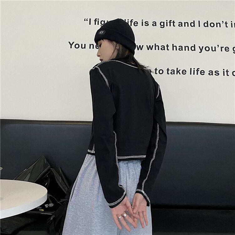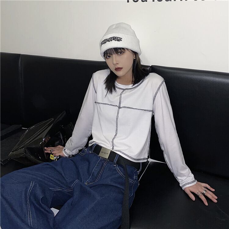 スプリング韓国ファッショントレンドショートクロップドトップス ラインゆったりシャツ ルーズブラックTシャツレディース ロング 春物 ボーイズ 長袖 Studios52175918899 | pLegLad Studios