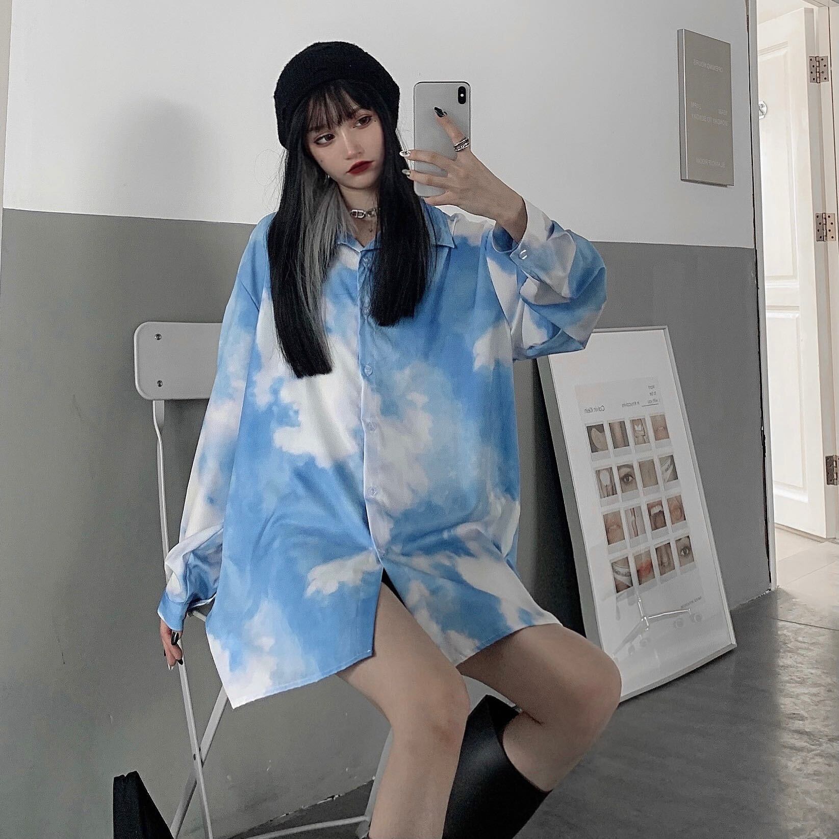 スプリング秋物韓国ファッショントレンドスタンダードブルーホワイトシャツ ルーズカジュアルジャケット レディース ロング レトロ 春物 オータム スタイル 長袖 Studios34298082594 | pLegLad Studios
