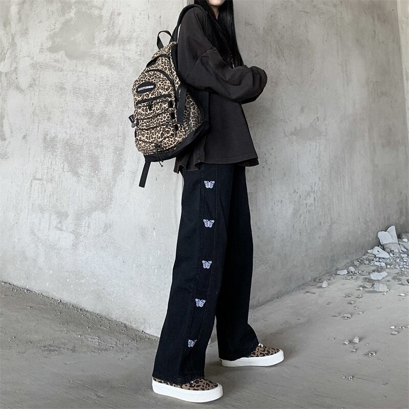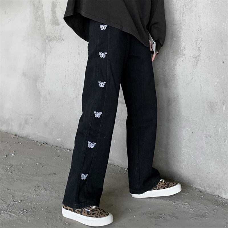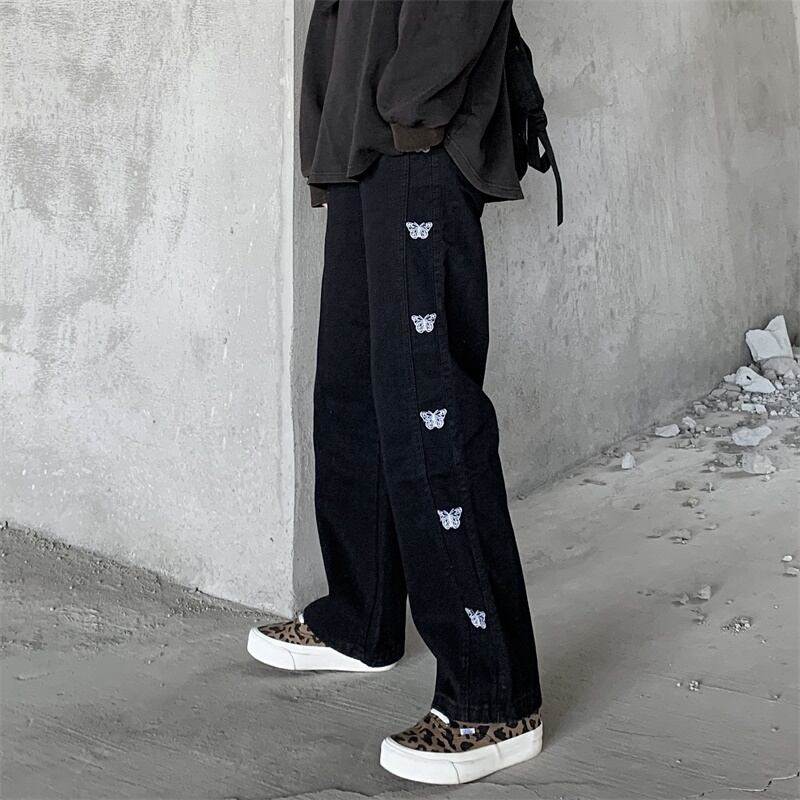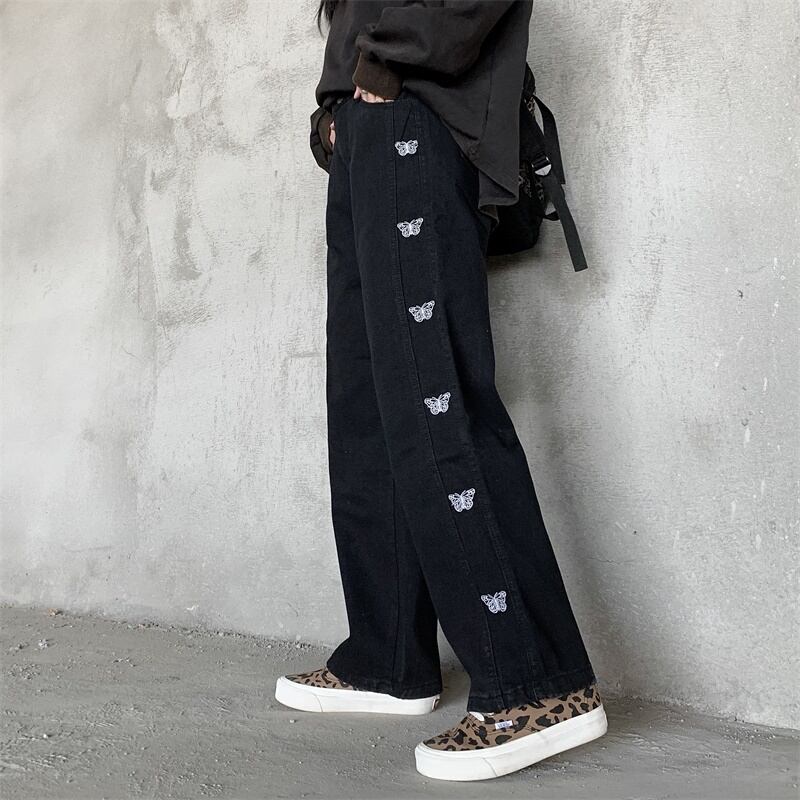 韓国ファッショントレンドスタンダードButterflyデザイン 刺繍ブラックルーズワイドレッグパンツ ハイウェストウェストジーンズ レディース レトロ ワイドパンツ ボーイズ スタイル ウエスト Studios32799768146