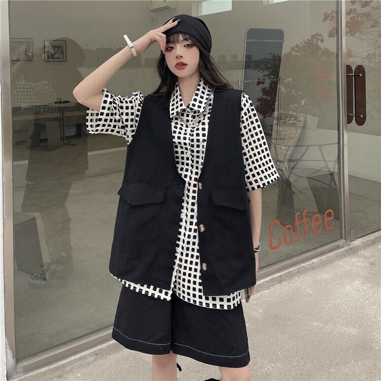 色:アプリコットベスト,アプリコットショーツ,黒のベスト,黒のショートパンツ,チェック柄半袖シャツ
