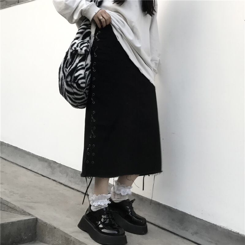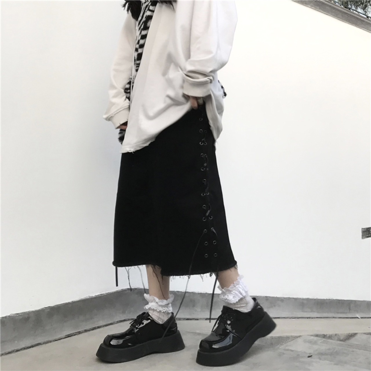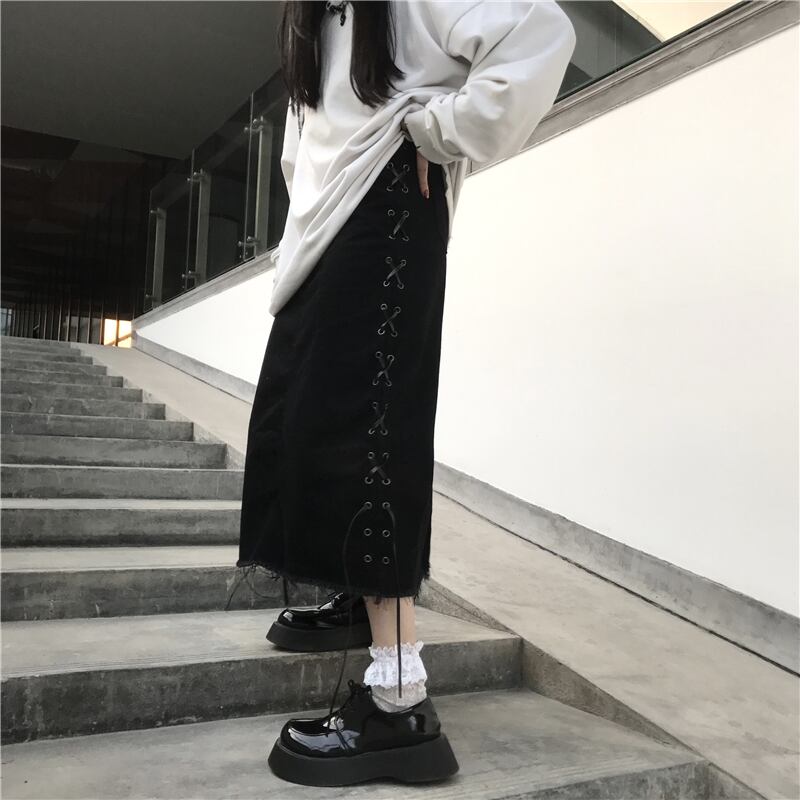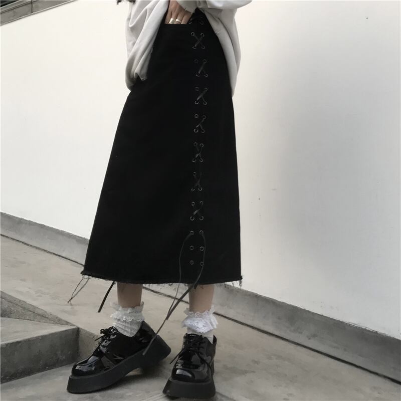韓国ファッショントレンドスタンダードスカート ダークブラックベルト カジュアルレディース レトロ ハーネス スタイル ミドル丈 Studios9045764833
