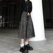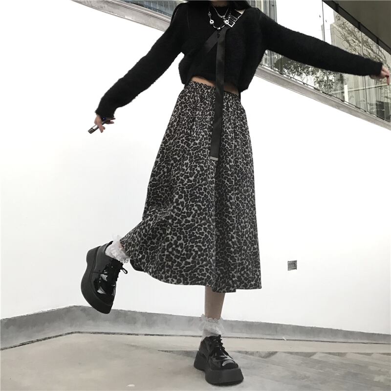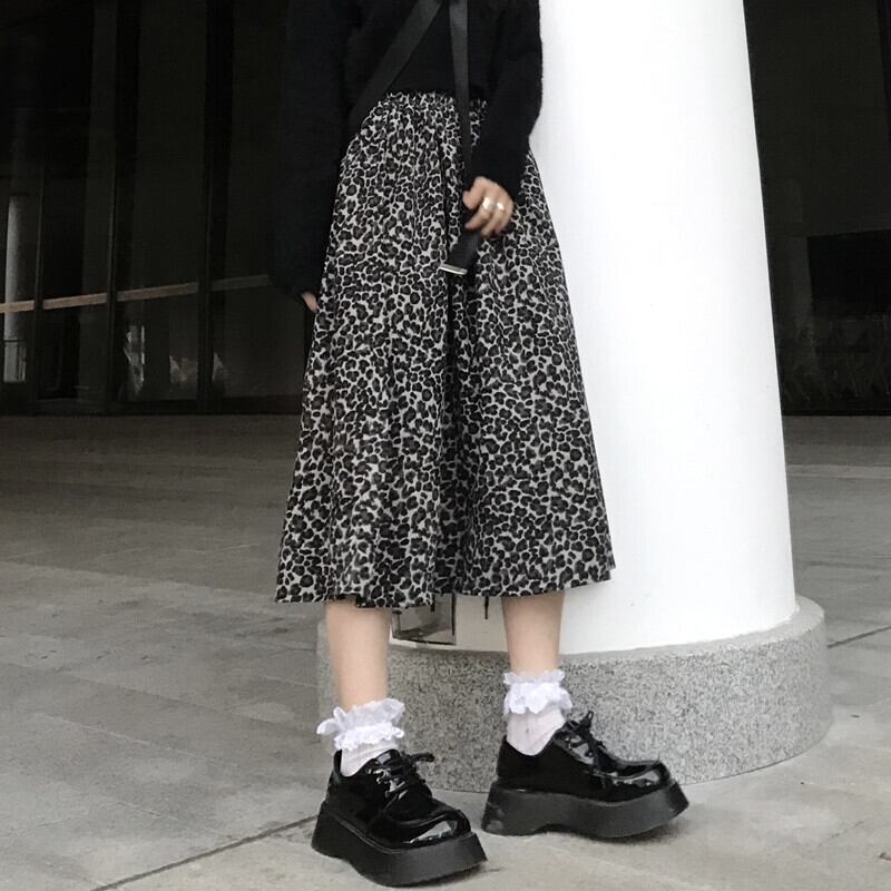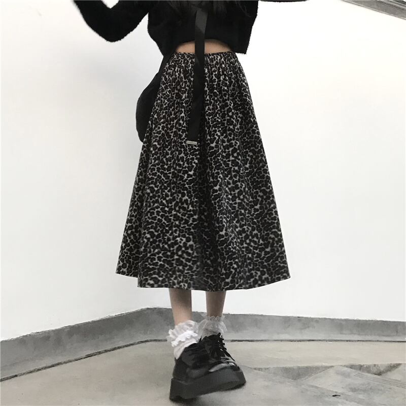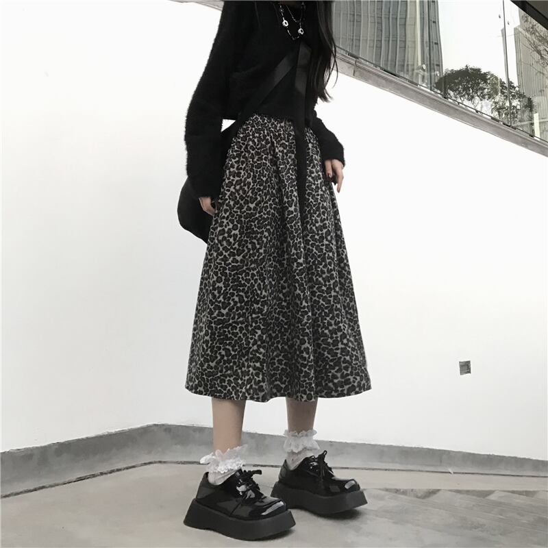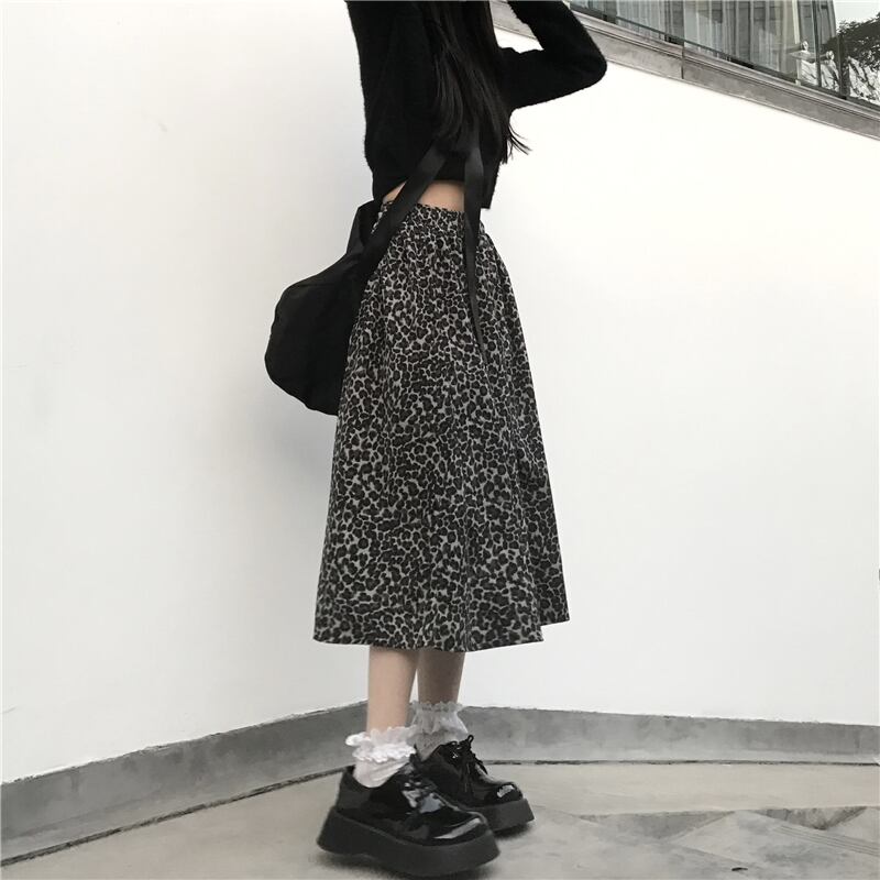 韓国ファッショントレンドスタイルスタンダードレオパードスカート ダークハイウェストウェスト薄手Aラインレディース レトロ ウエスト ミドル丈 Studios99715733847