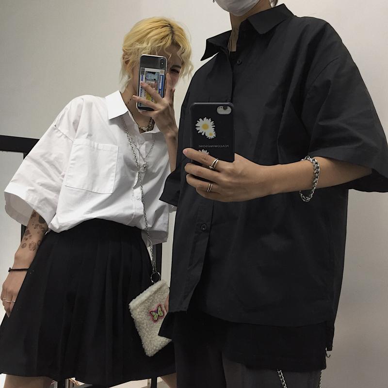 夏服韓国ファッショントレンドスタンダードルーズソリッド カラーワイルド半袖スリーブシャツ メンズレディース ショート レトロ ハーフスリーブ 原宿 夏物 ソリッドカラー ボーイズ Studios45938672591 | pLegLad Studios
