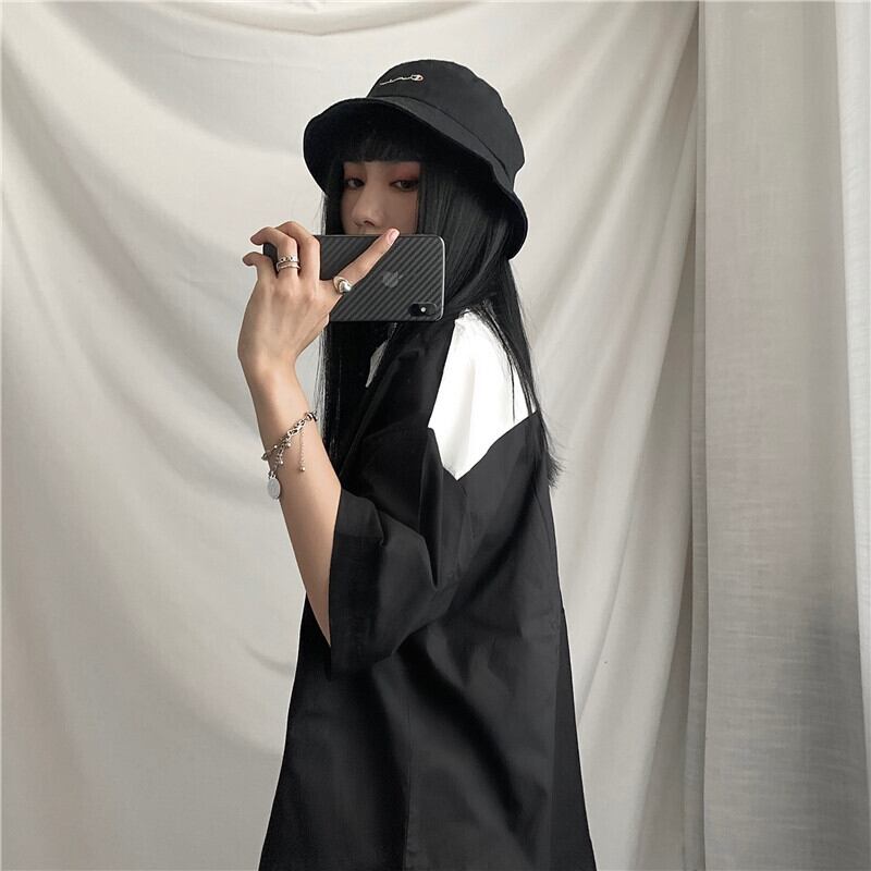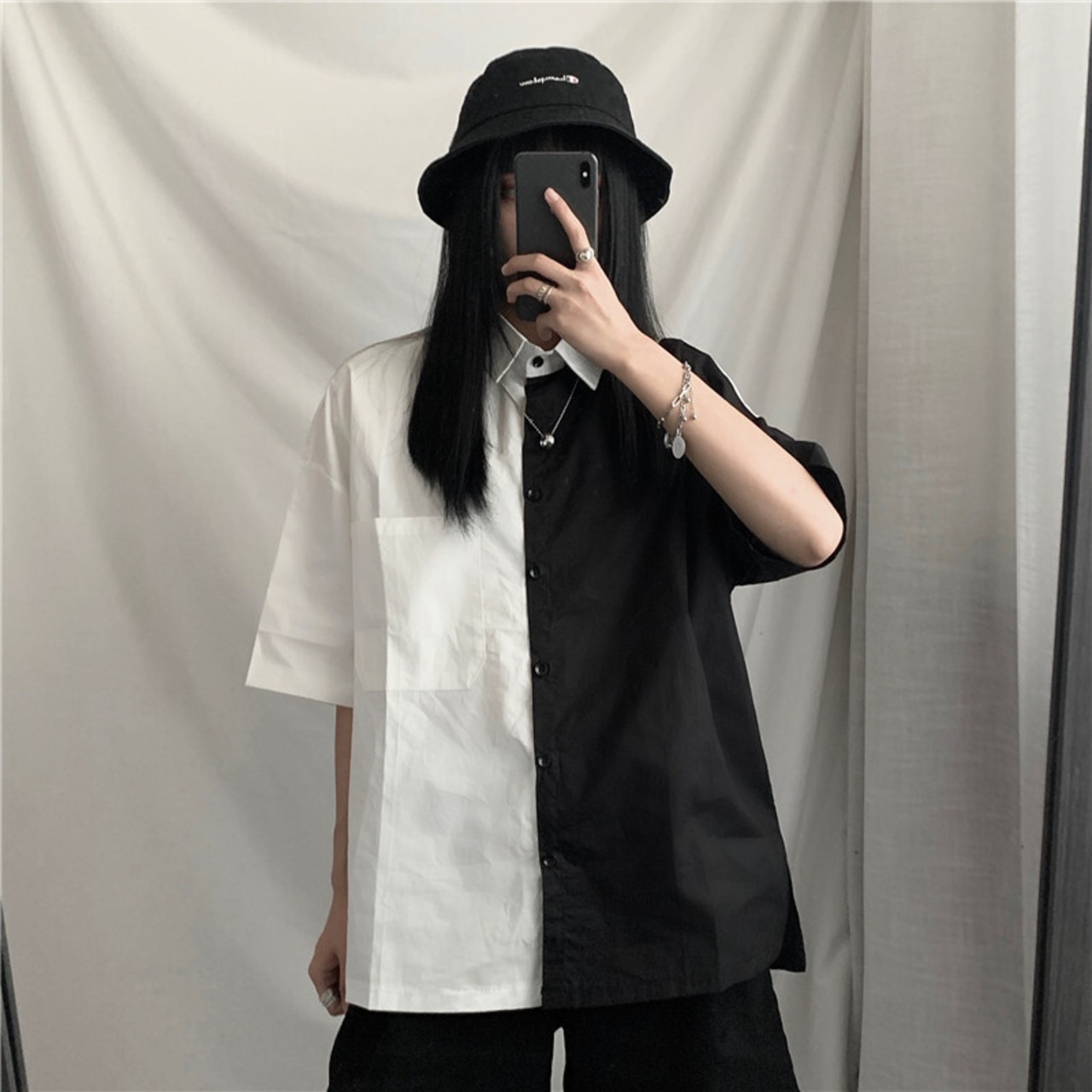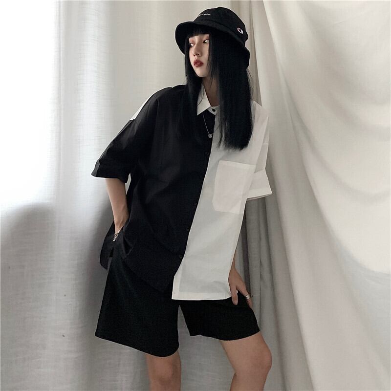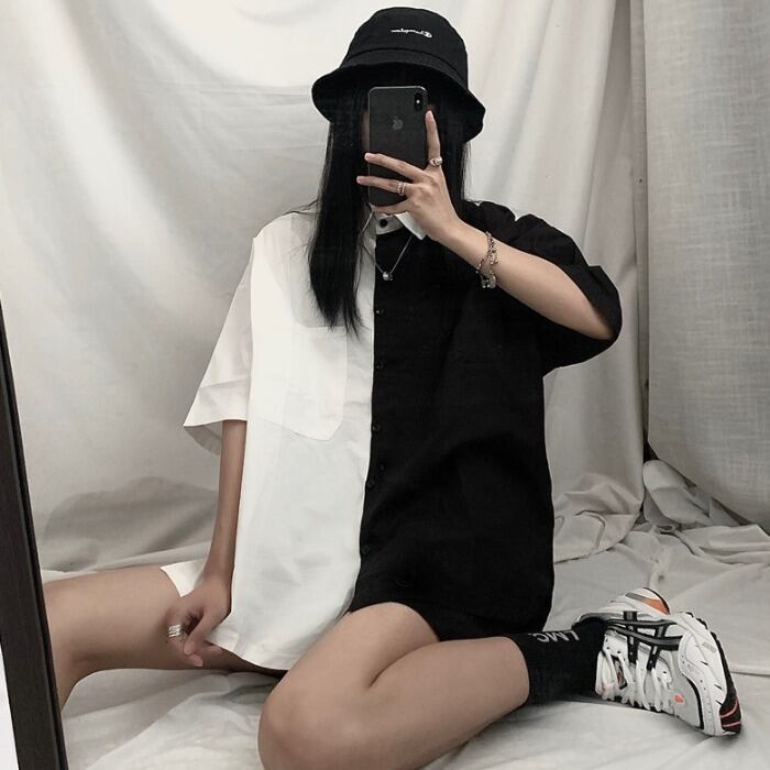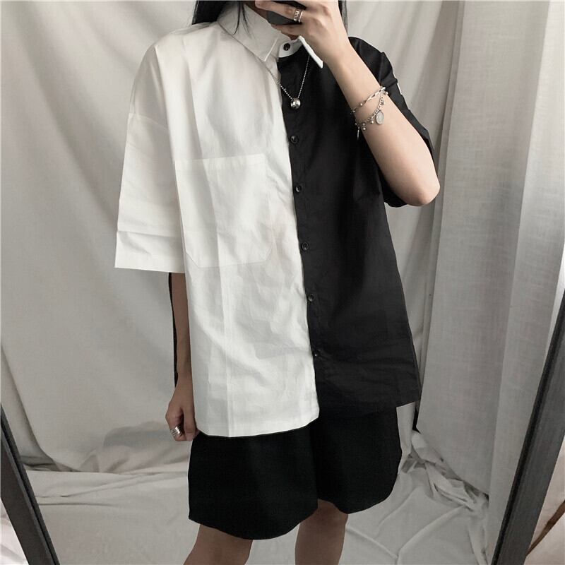 夏服韓国ファッショントレンドブラックホワイトカラーカジュアルシャツ ルーズレディース 夏物 ステッチ スタイル Studios59161921067