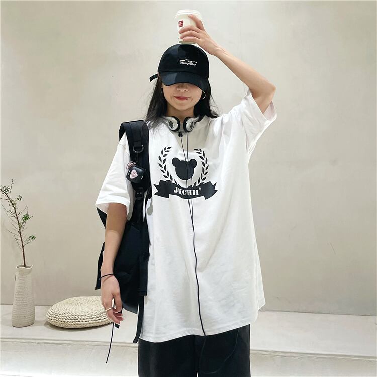夏服韓国ファッショントレンドスタンダードプリント柄カジュアルトップス ルーズラウンドネックTシャツレディース レトロ 夏物 Oネック スタイル Studios85102121249