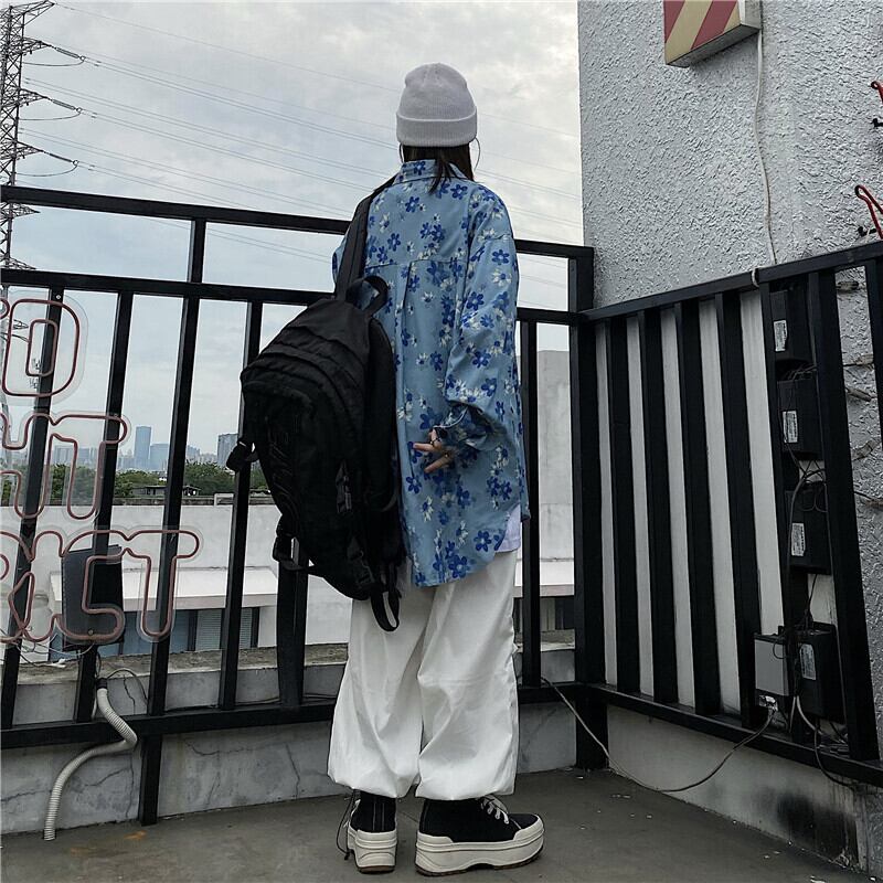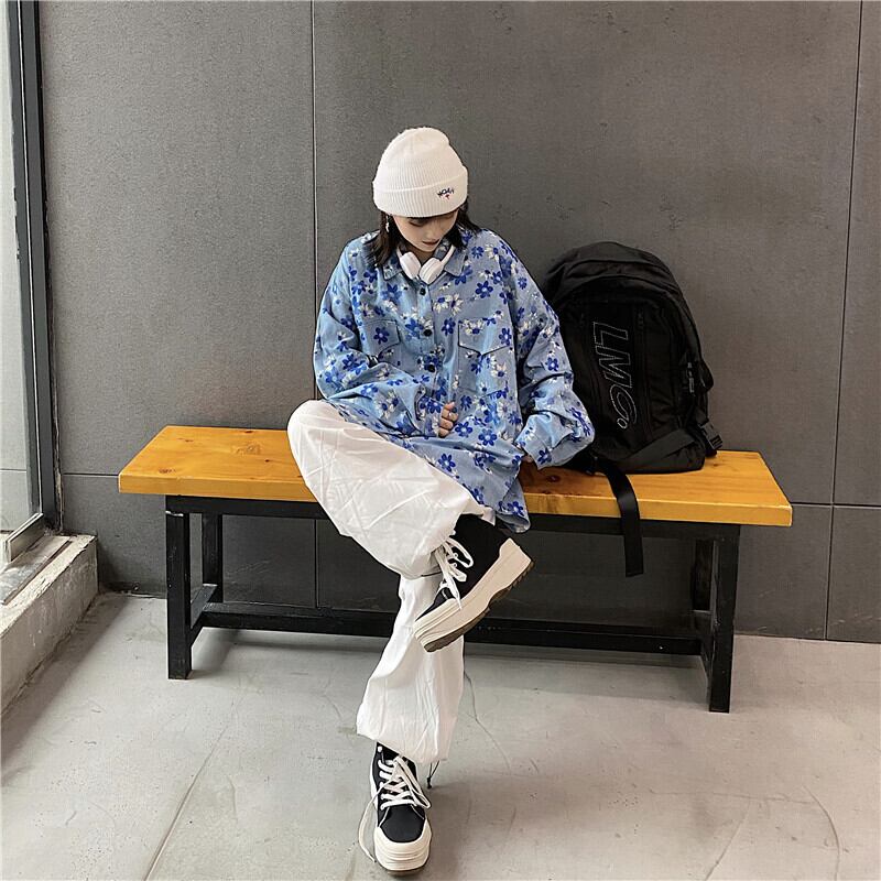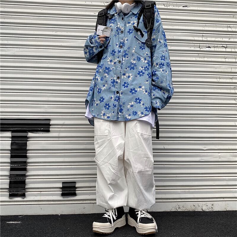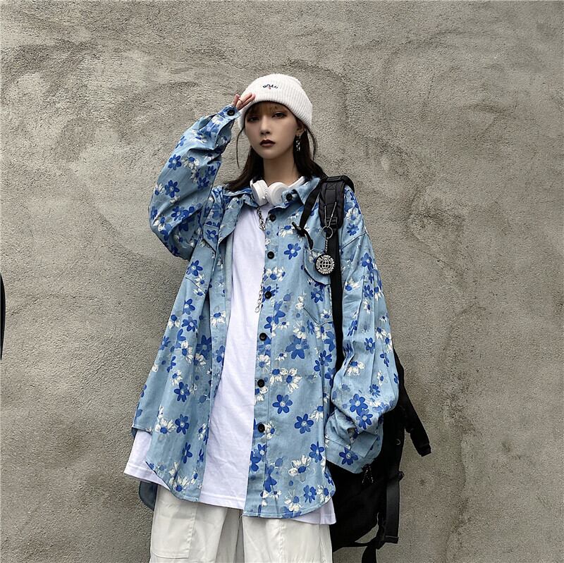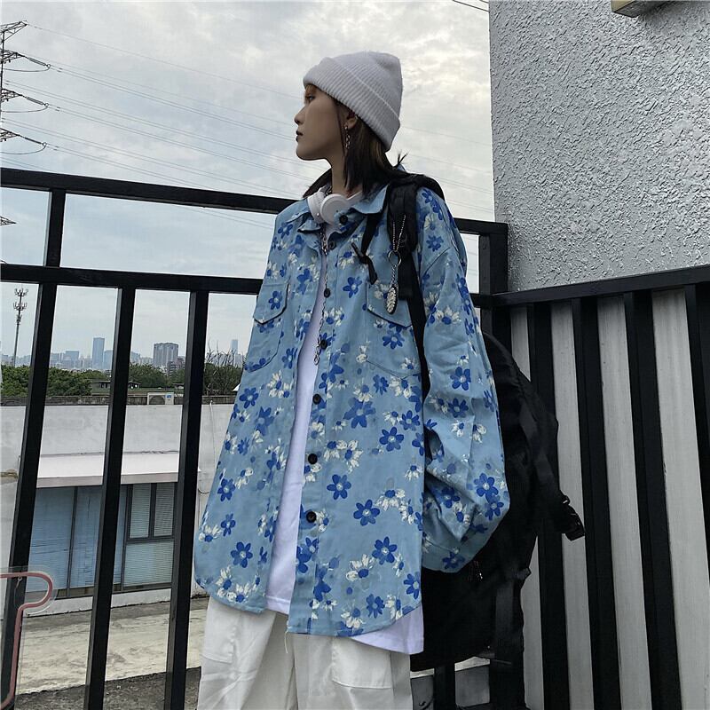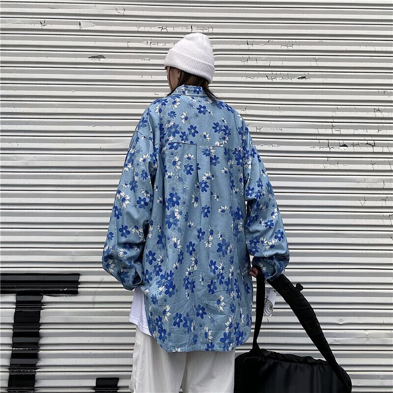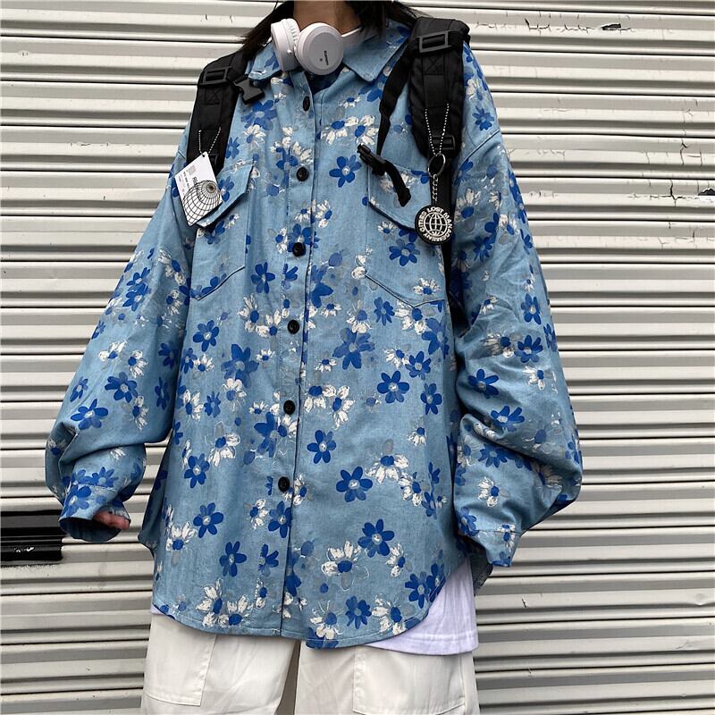 スプリングシャツ レディース韓国ファッションスタイルブルーカジュアルルーズジャケット ロング 春物 フラワーデザイン ボーイズ 長袖 Studios27558170945