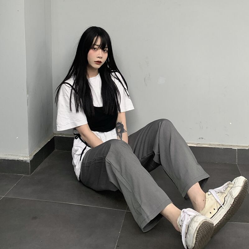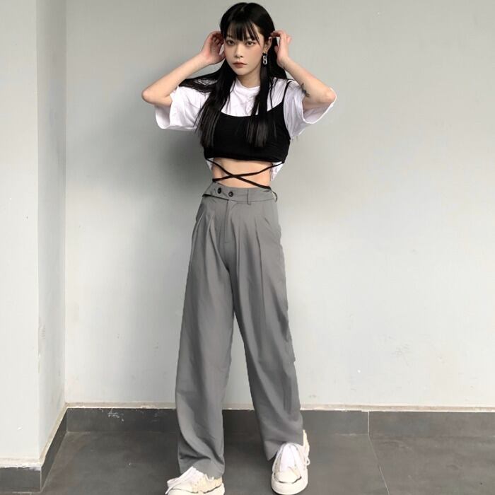 夏服韓国ファッショントレンドスタンダードグレーパンツ ルーズハイウェストウェスト薄手カジュアルレディース レトロ 夏物 ボーイズ スタイル ウエスト Studios57249240715 | pLegLad Studios