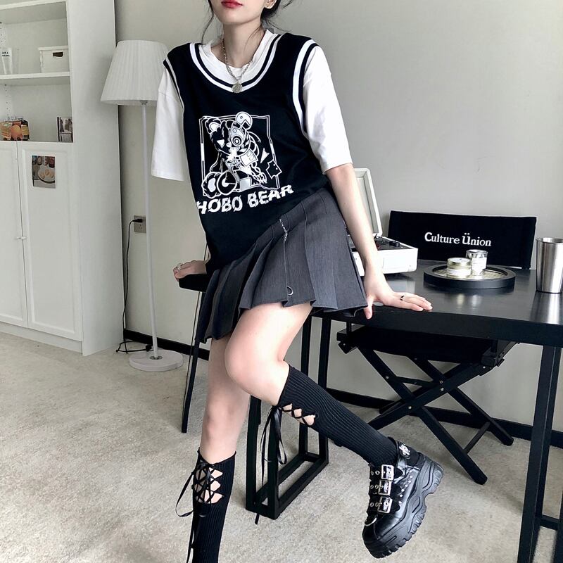 夏服韓国ファッショントレンドプリント柄ツーピースカジュアルルーズTシャツレディース ストリート 夏物 ステッチ スタイル Studios28193540472