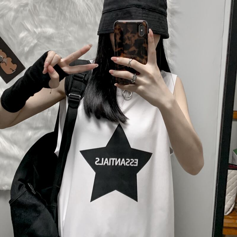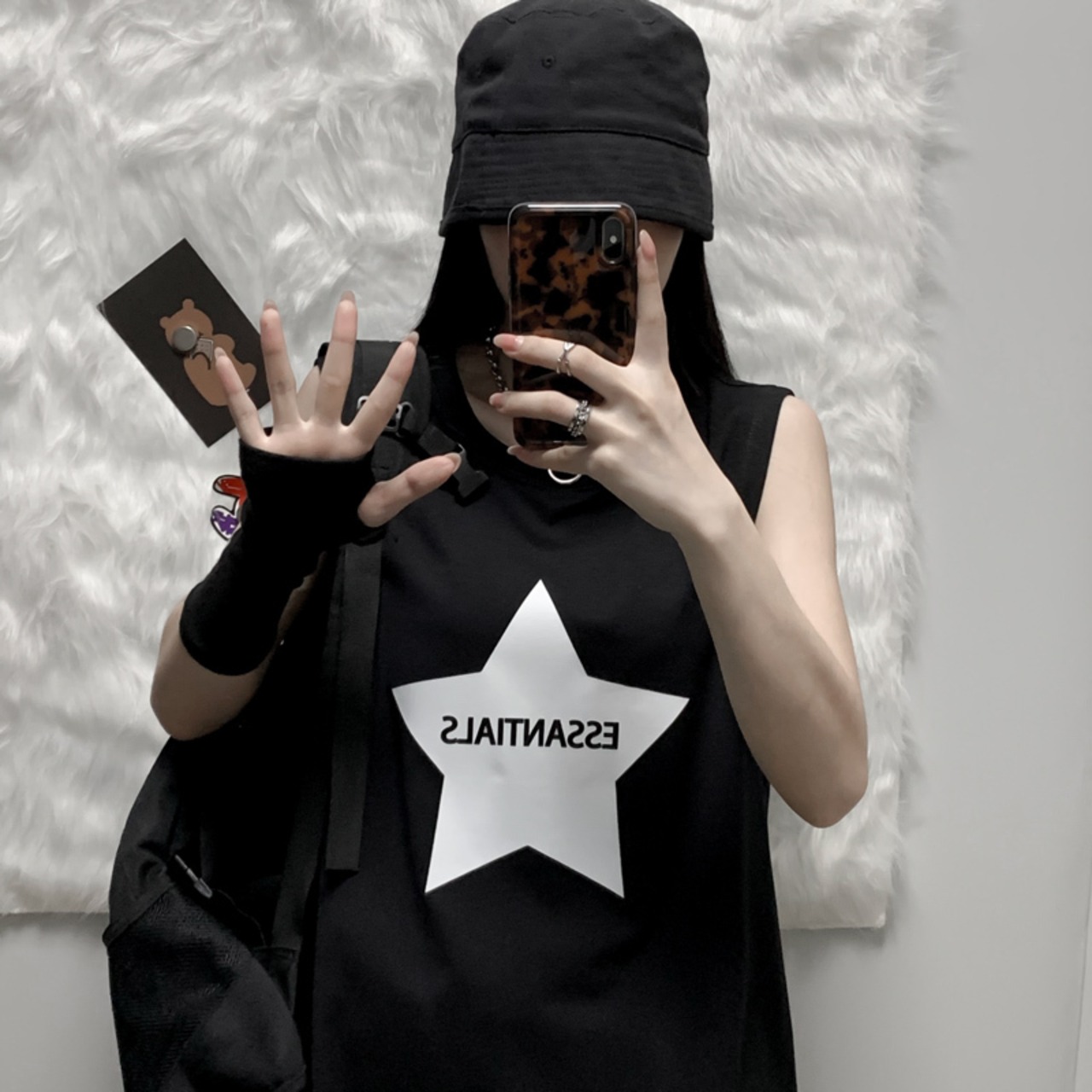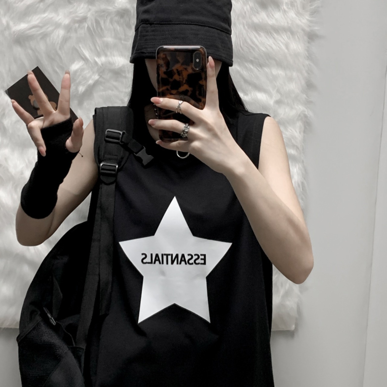 ノースリーブトップス レディース夏服韓国ファッショントレンドスタンダードプリントルーズブラックTシャツ レトロ 夏物 スタイル Studios98564987294