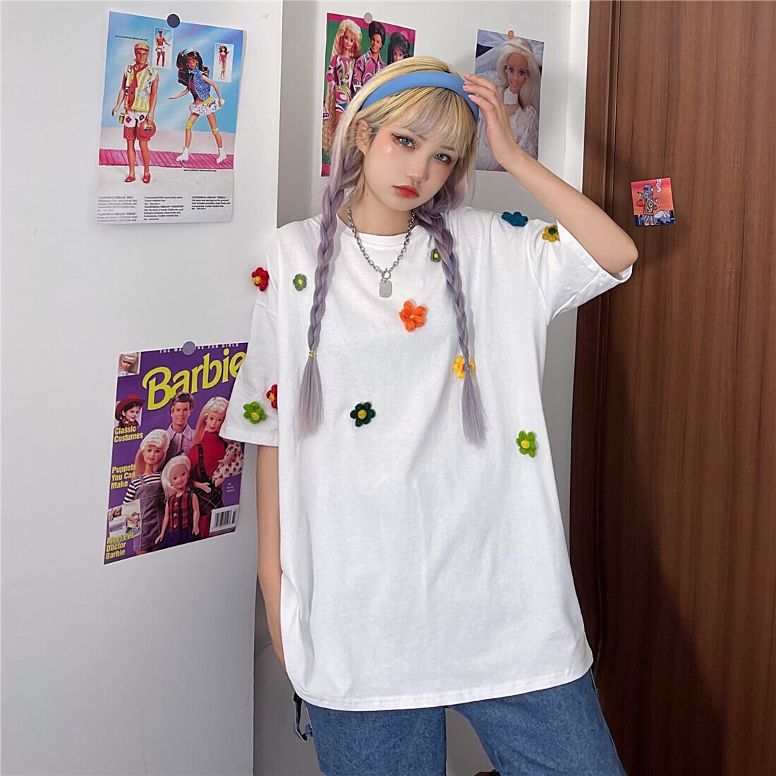 ホワイトTシャツシャツ レディース夏服韓国ファッショントレンドカジュアルルーズ 大人ガーリー スウィート キュート 夏物 フラワーデザイン Studios75253673429