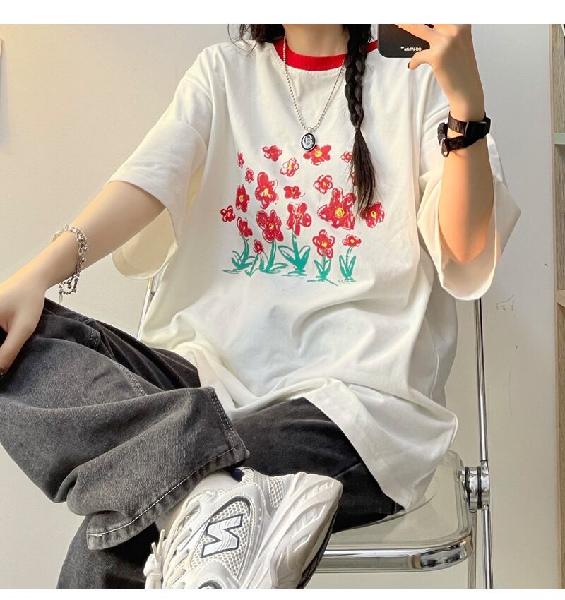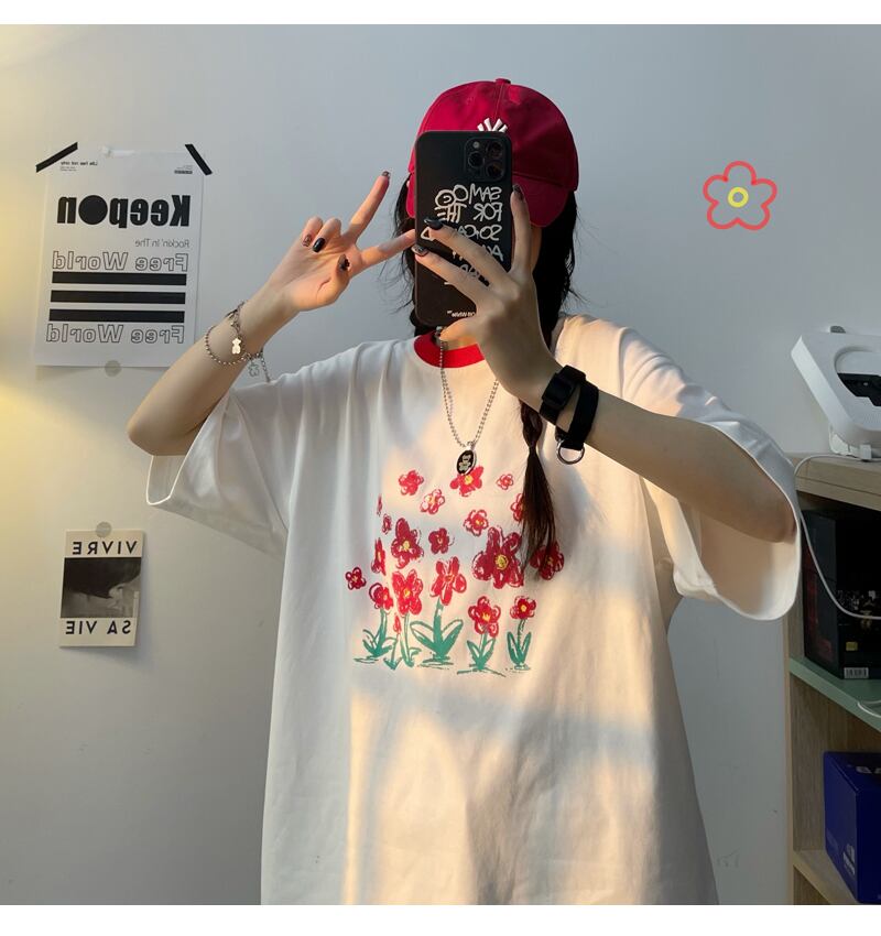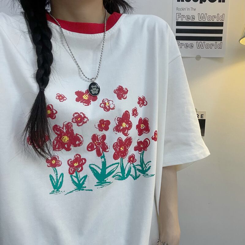 Tシャツレディース夏服韓国ファッショントレンドスタンダードレッドFlowerデザイン ルーズカジュアルトップス レトロ 夏物 フラワーデザイン スタイル Studios6237327102