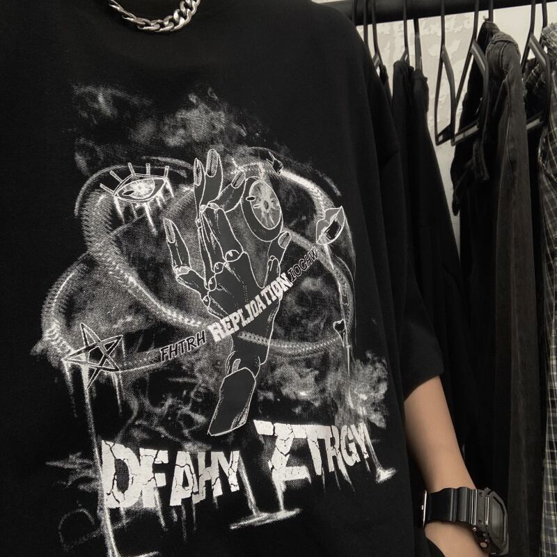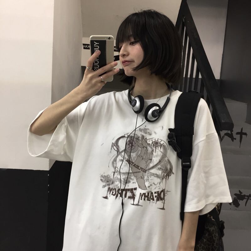 夏服韓国ファッショントレンドダークスタンダードパターンプリントルーズカジュアルTシャツメンズレディース レトロ 夏物 スタイル Studios13605159170