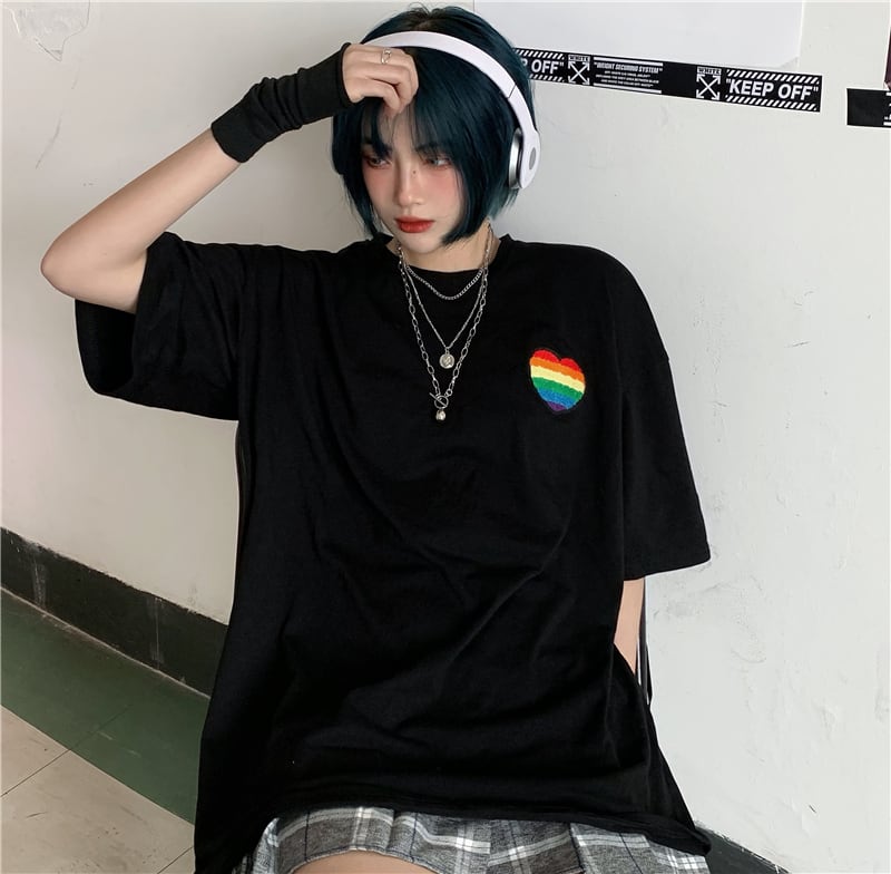 夏服韓国ファッショントレンドスタンダードハート刺繍カジュアルジャケット ラウンドネックルーズTシャツレディース レトロ 夏物 Oネック スタイル Studios95176510899 | pLegLad Studios