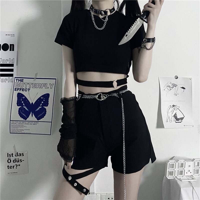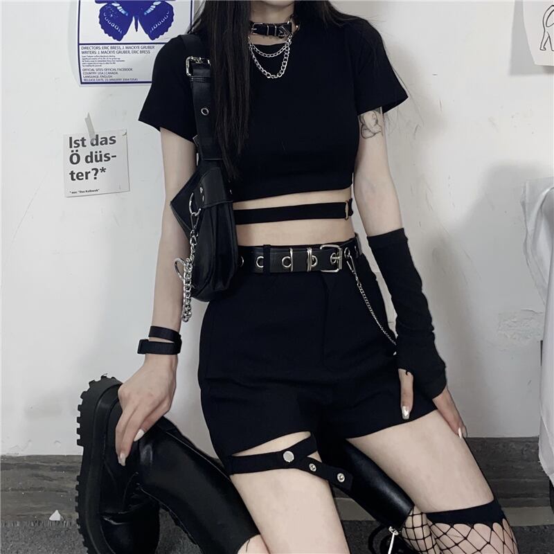 ショーツ レディース夏服韓国ファッショントレンドスタンダードダークハイウェストウェスト薄手Tシャツトップス ショート レトロ 大人ガーリー スウィート キュート カジュアル 夏物 スタイル ウエスト Studios90238840538 | pLegLad Studios