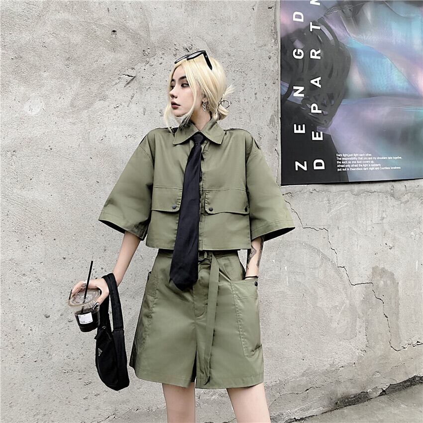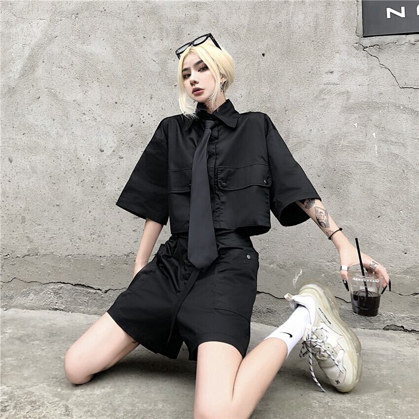 レディース夏服韓国ファッショントレンドスタンダードハイウェストウェストショーツ シャツ トップス ショート レトロ 夏物 スタイル ウエスト Studios54497841087 | pLegLad Studios
