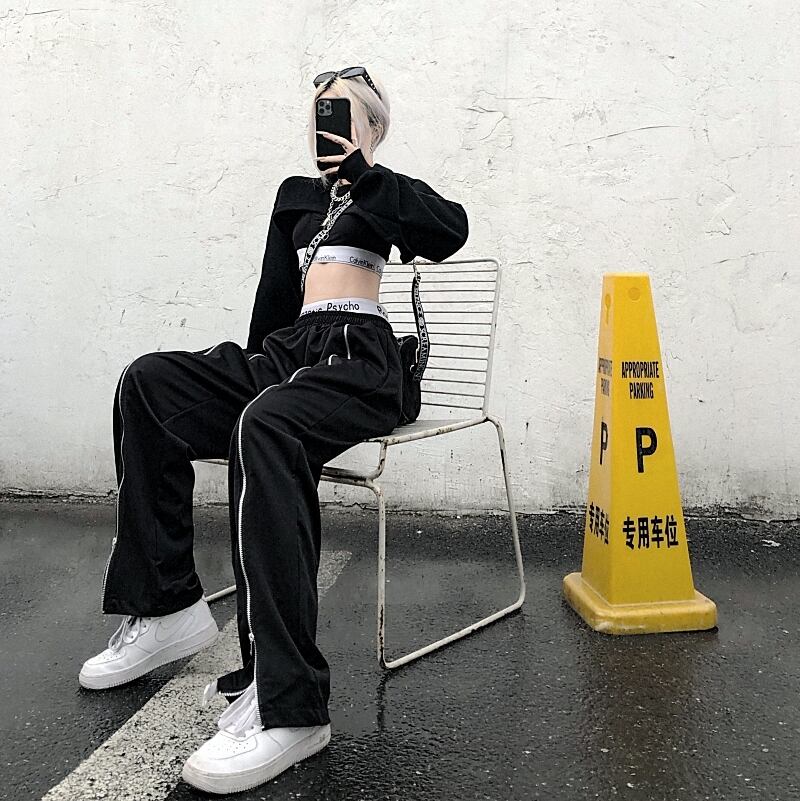 ワイドレッグカジュアルパンツ レディース夏服韓国ファッショントレンドスタイルダブルジッパーハイウェストウェストルーズスリムブラック 原宿 夏物 ワイドパンツ ウエスト Studios17813852013 | pLegLad Studios