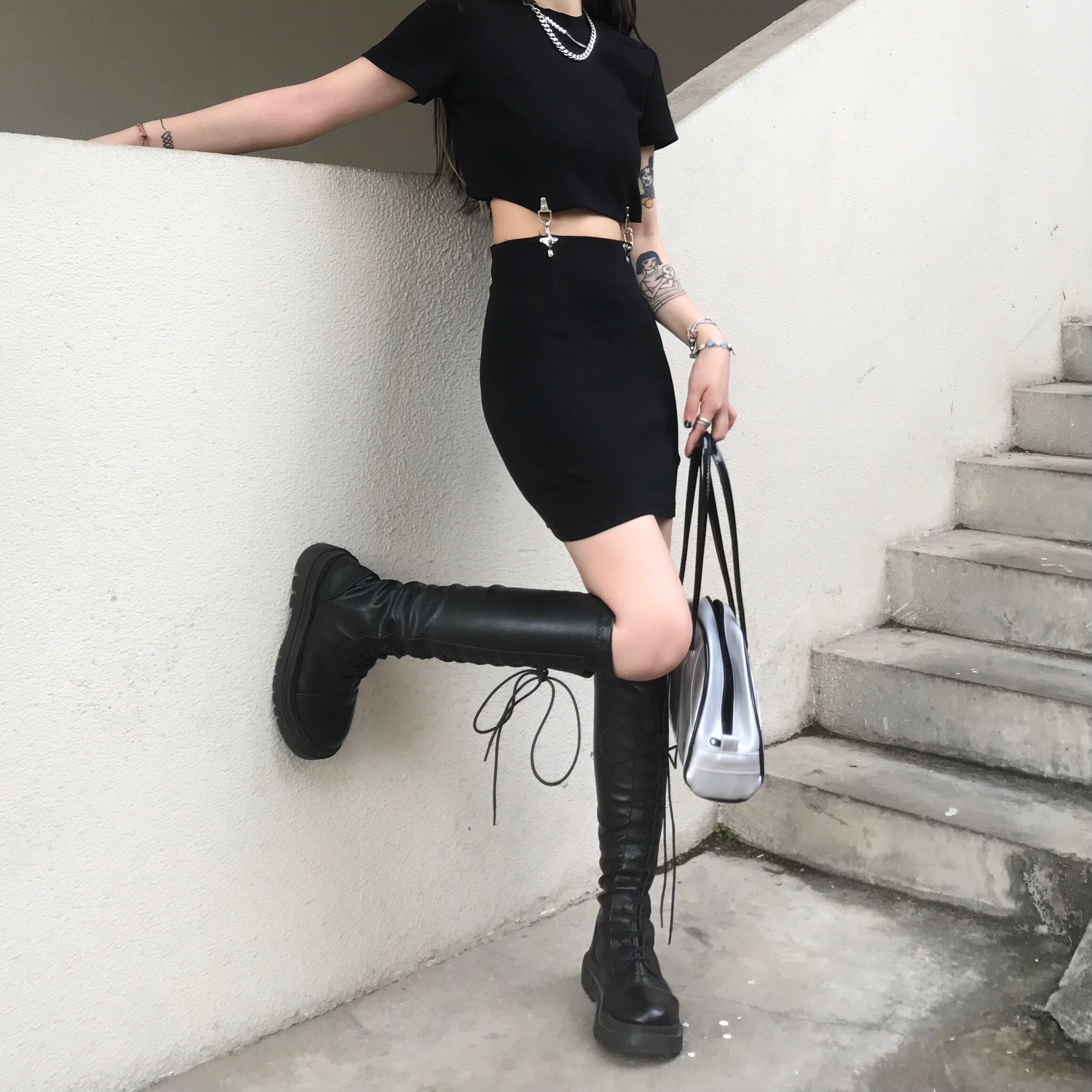 夏服レディース韓国ファッショントレンドスタンダードスタイルブラックショートTシャツトップス ハイウェストウェストスカート レトロ 夏物 ウエスト Studios78320711449 | pLegLad Studios