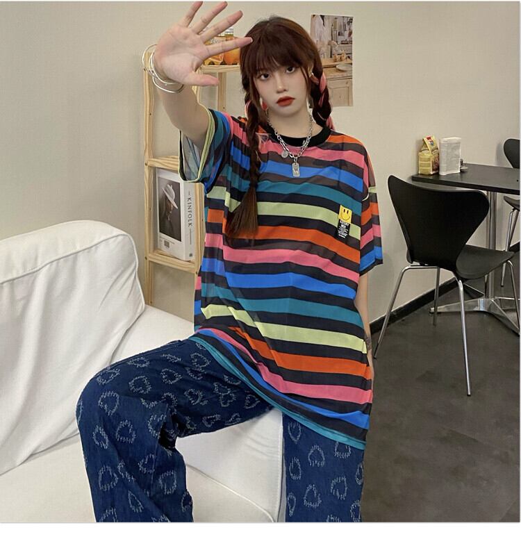 夏服韓国ファッショントレンドスタイルスタンダードストライプラウンドネックルーズTシャツトップス レディース レトロ 原宿 夏物 Oネック Studios77106163769 | pLegLad Studios