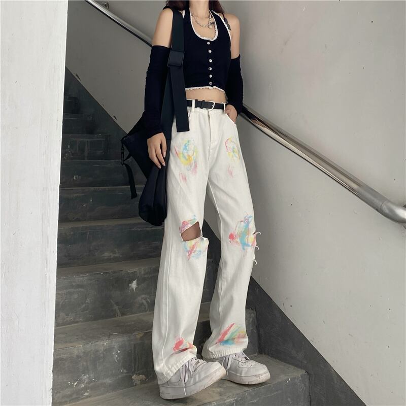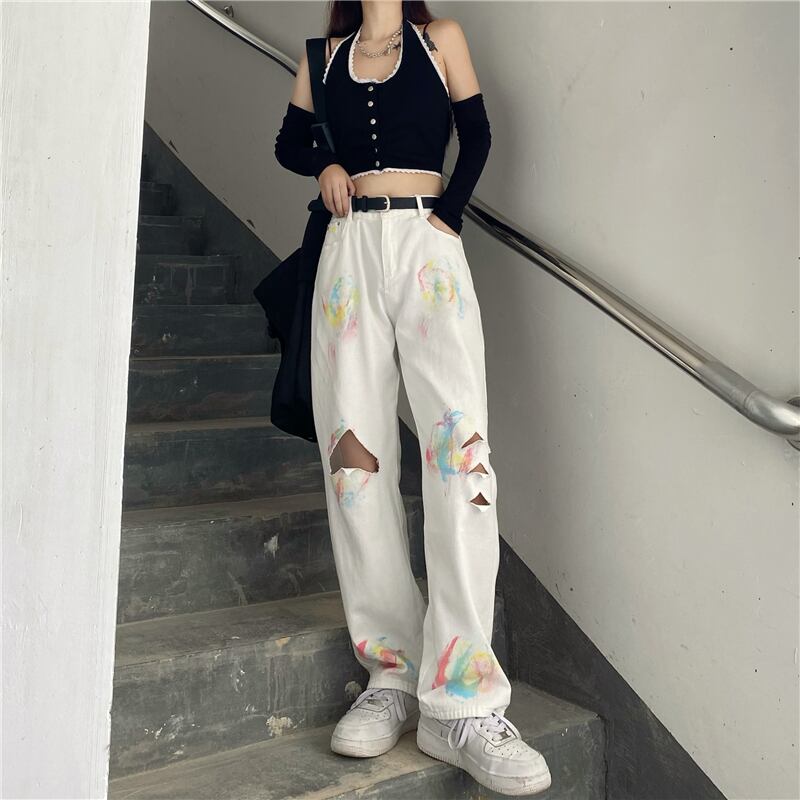 ホワイトジーンズ レディース夏服韓国ファッショントレンドカラールーズハイウェストウェストワイドレッグ ストリート 夏物 ワイドパンツ スタイル ウエスト Studios10668573598 | pLegLad Studios