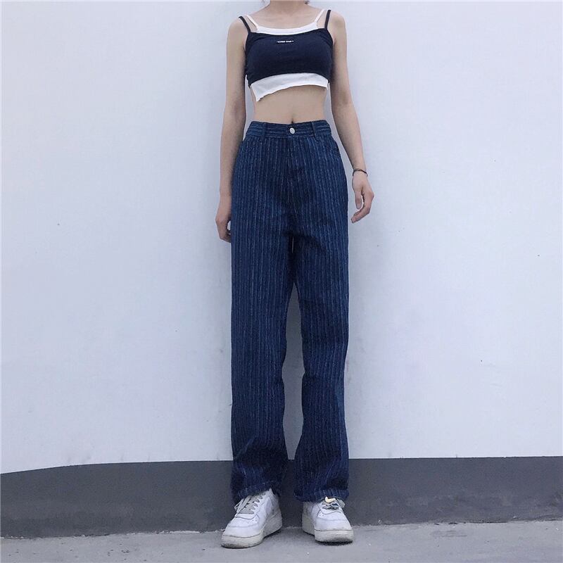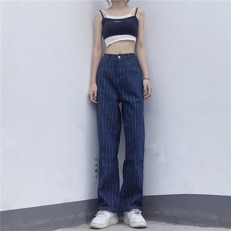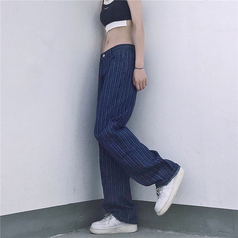 夏服韓国ファッショントレンドスタンダードストライプブルーパンツ ルーズハイウェストウェスト薄手ジーンズ レディース レトロ 夏物 スタイル ウエスト Studios17591646453 | pLegLad Studios