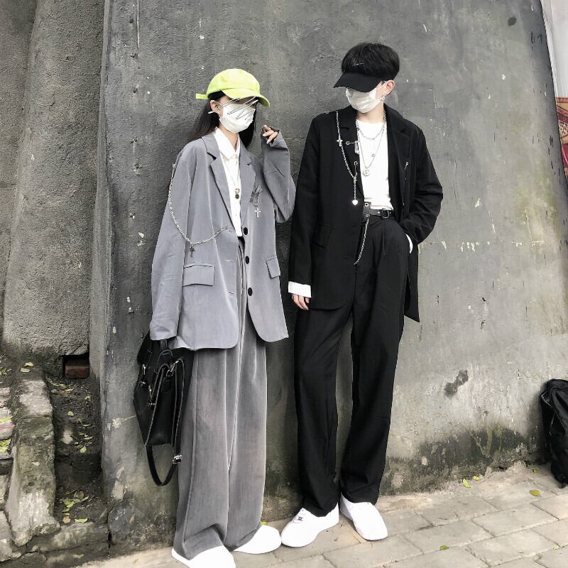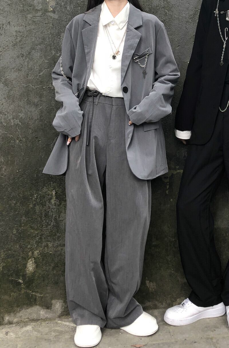 色:黒いスーツ,グレーのスーツ,黒のワイドレッグパンツ,グレーワイドレッグパンツ,スリーピースチェーン