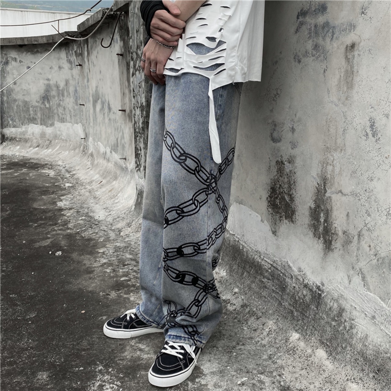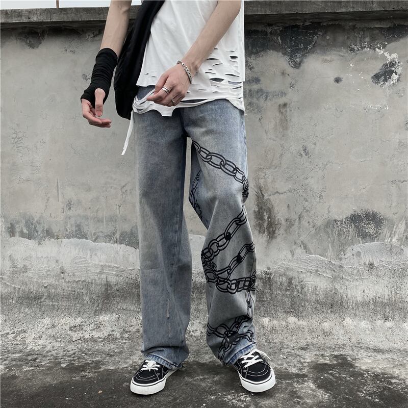 韓国ファッショントレンドチェーン プリント柄ルーズ薄手ハイウェストパンツ カジュアルジーンズ メンズレディース スタイル ウエスト Studios98373913458 | pLegLad Studios