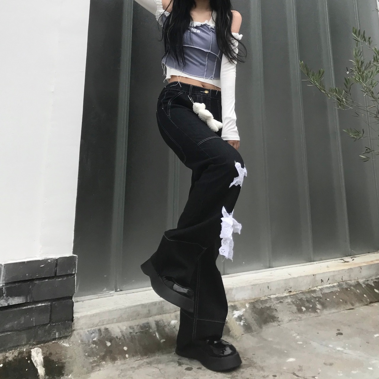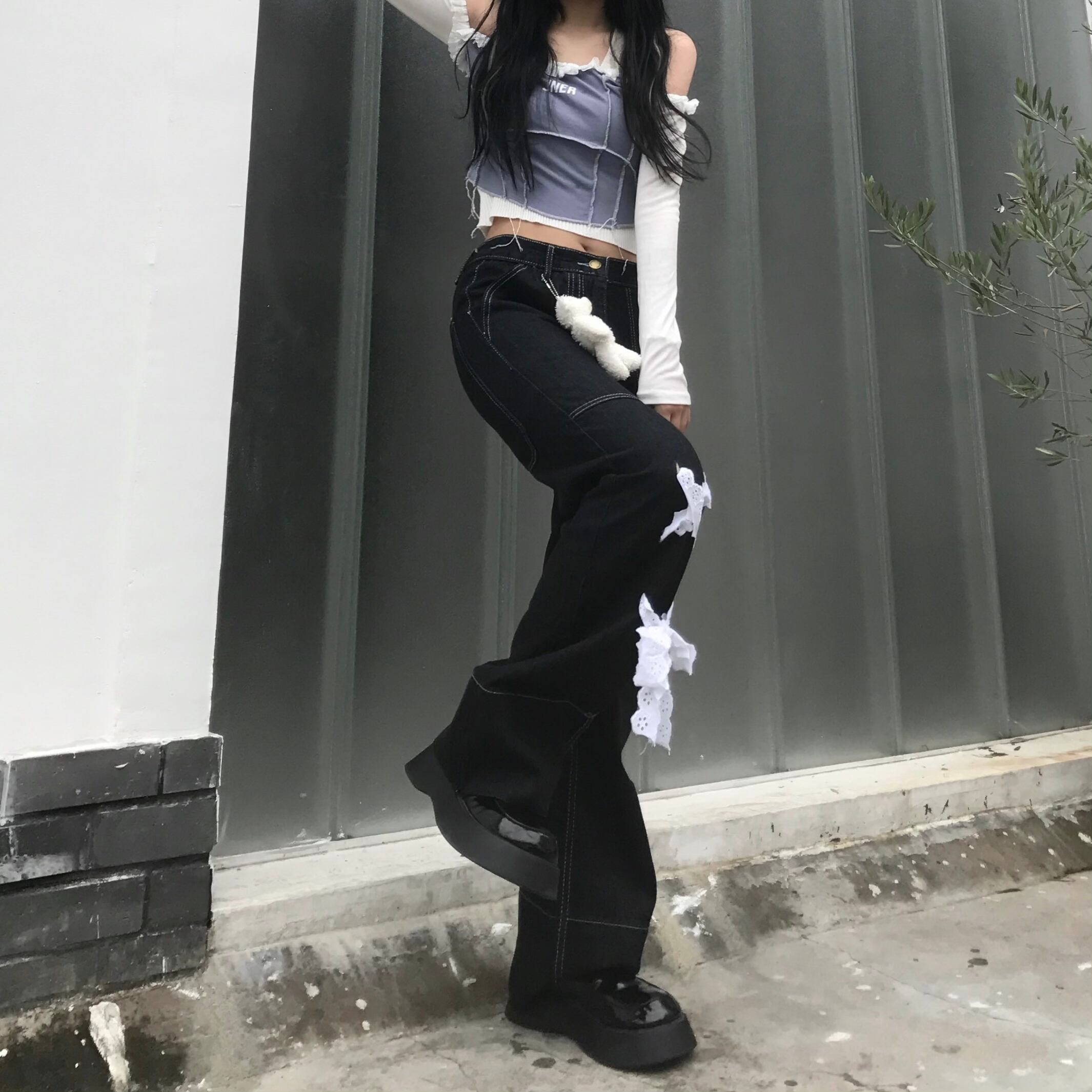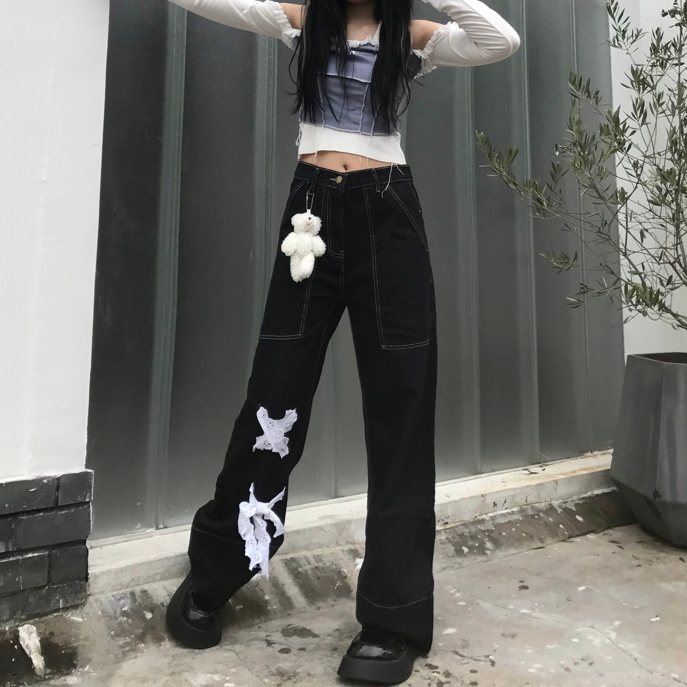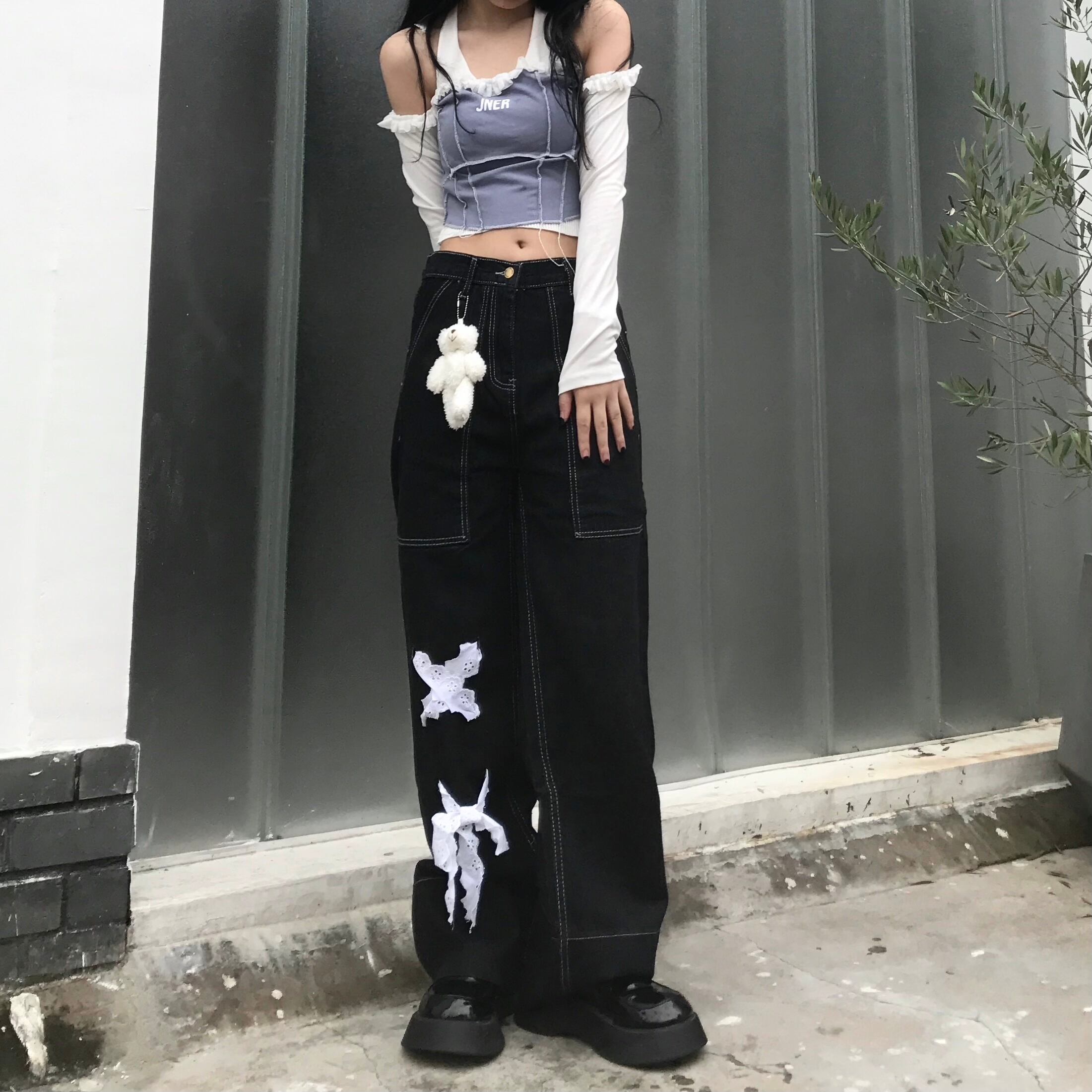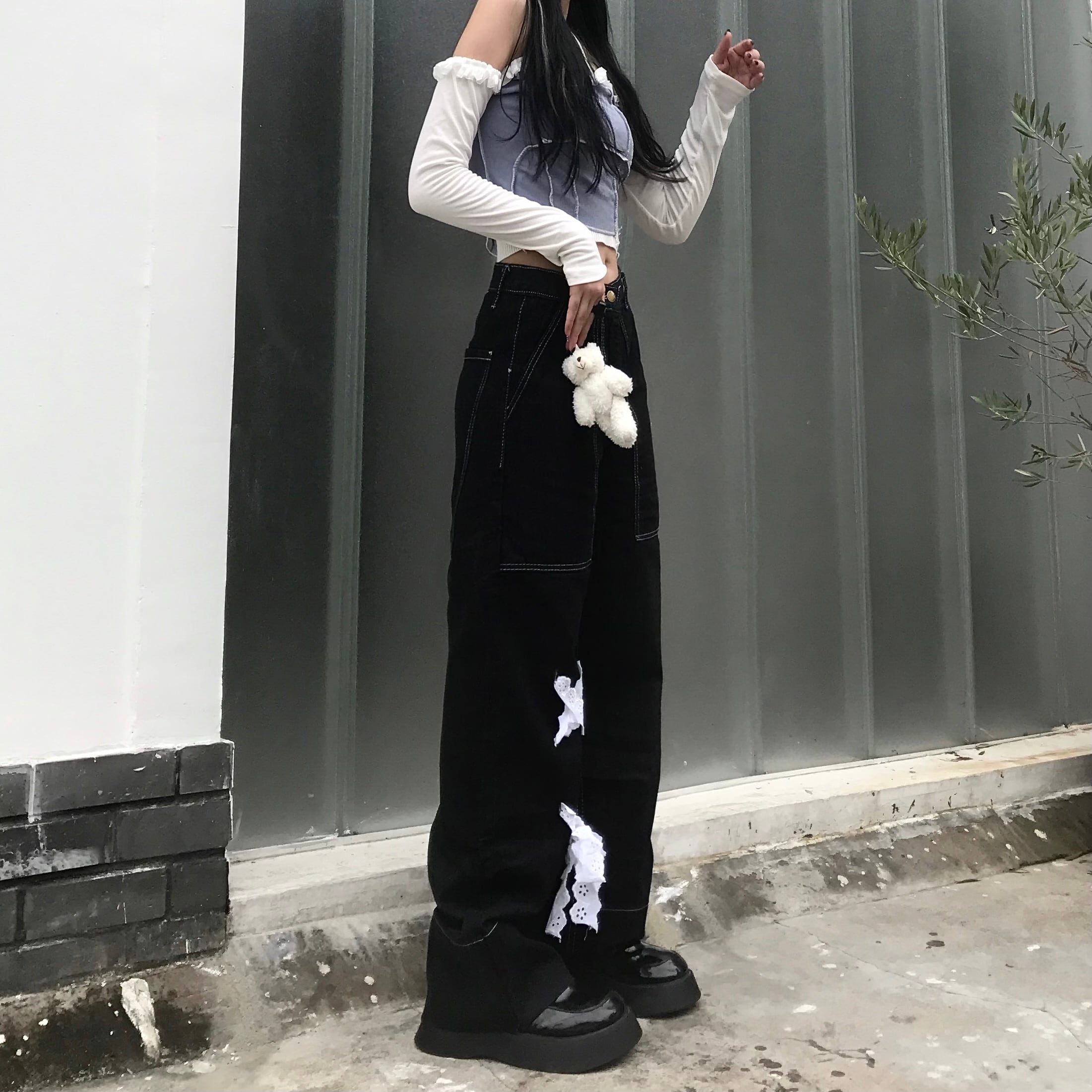 ジーンズ レディース夏服韓国ファッショントレンドレースルーズハイウェストウェスト薄手ワイドレッグパンツ ストリート 夏物 ワイドパンツ ステッチ スタイル ウエスト Studios17023744457 | pLegLad Studios