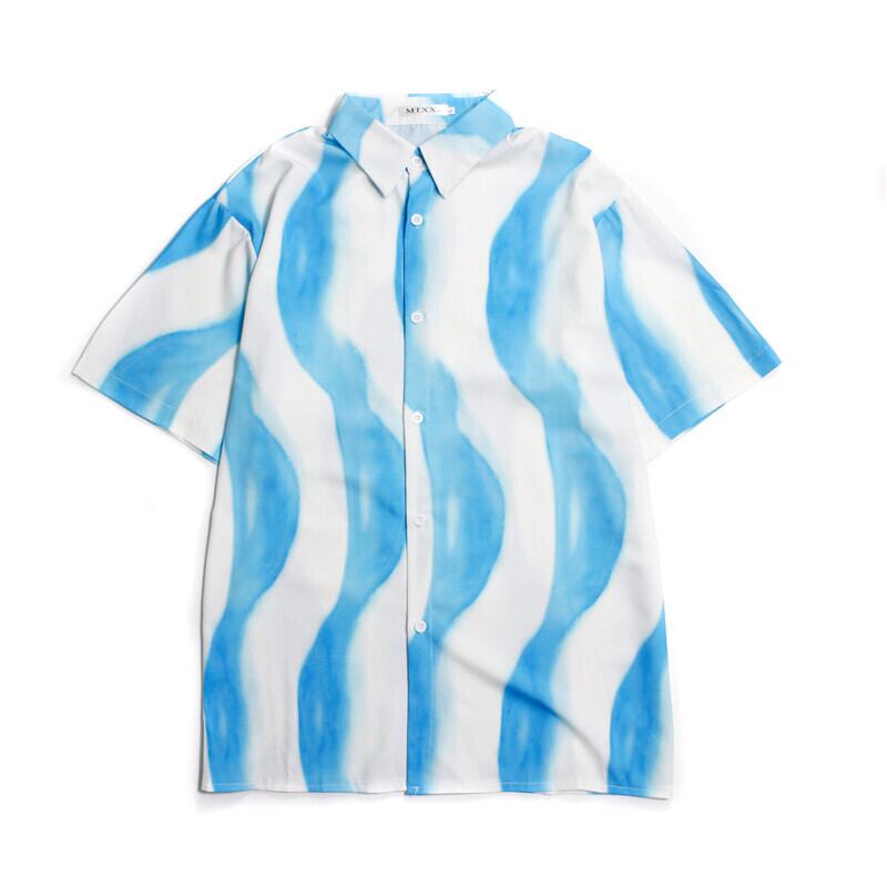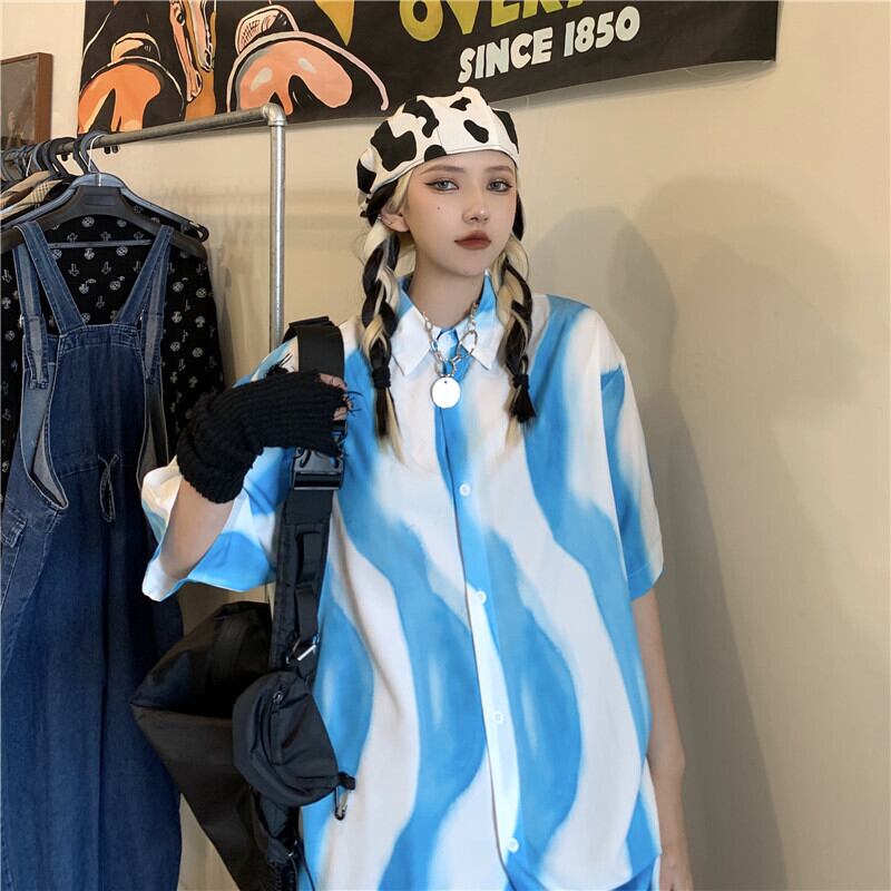 夏服韓国ファッショントレンドスタンダードブルーホワイトパターンシャツ カジュアルルーズレディース レトロ ストリート 夏物 スタイル Studios81214669037 | pLegLad Studios