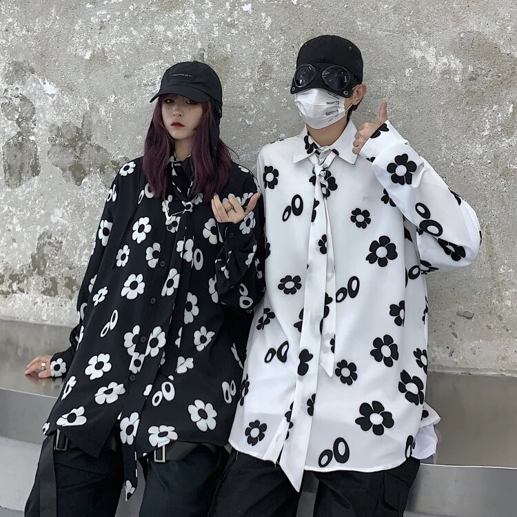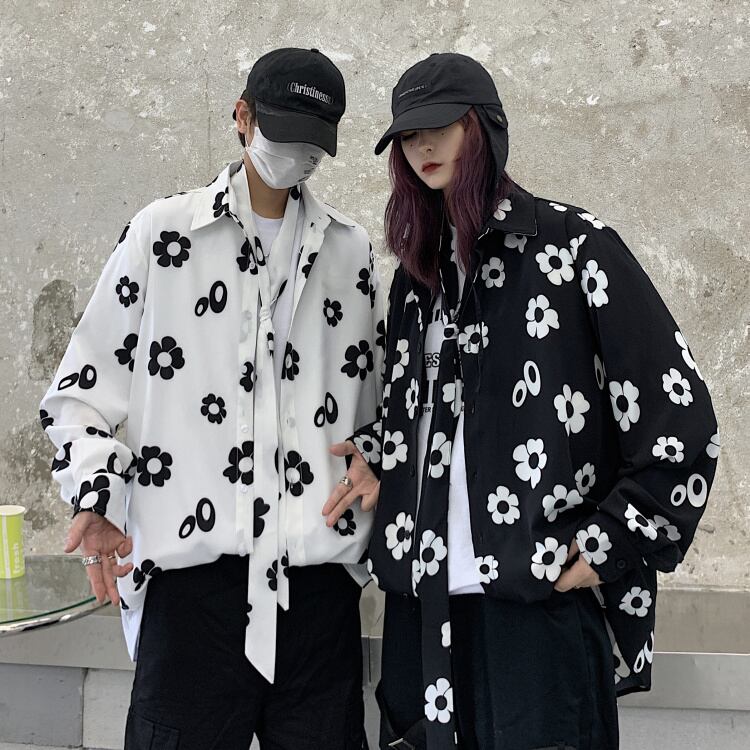 スプリング秋物トレンドスタイルスタンダードルーズブラックシャツ メンズレディース ロング レトロ ストリート 原宿 春物 オータム フラワーデザイン 長袖 Studios41674021848 | pLegLad Studios