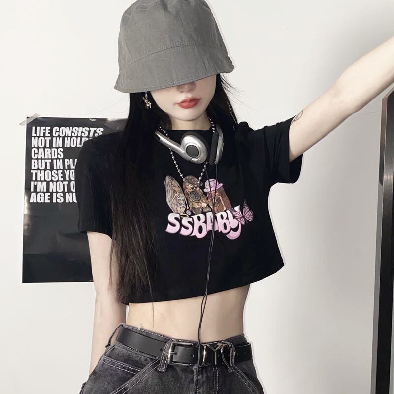 ショートジャケット レディース夏服韓国ファッショントレンドプリント柄ハイウェストウェスト半袖スリーブTシャツ ハーフスリーブ 夏物 スタイル ウエスト Studios51559991367 | pLegLad Studios