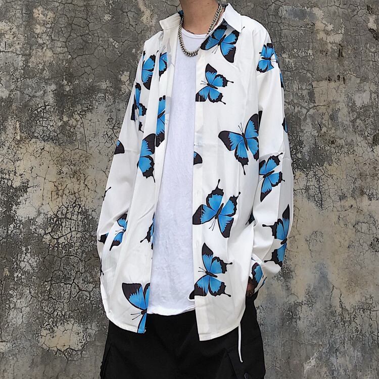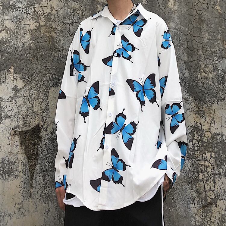 トレンドスタンダードButterflyデザイン プリント柄シャツ ルーズトップス メンズレディース ロング レトロ ストリート 長袖 Studios99548438132 | pLegLad Studios