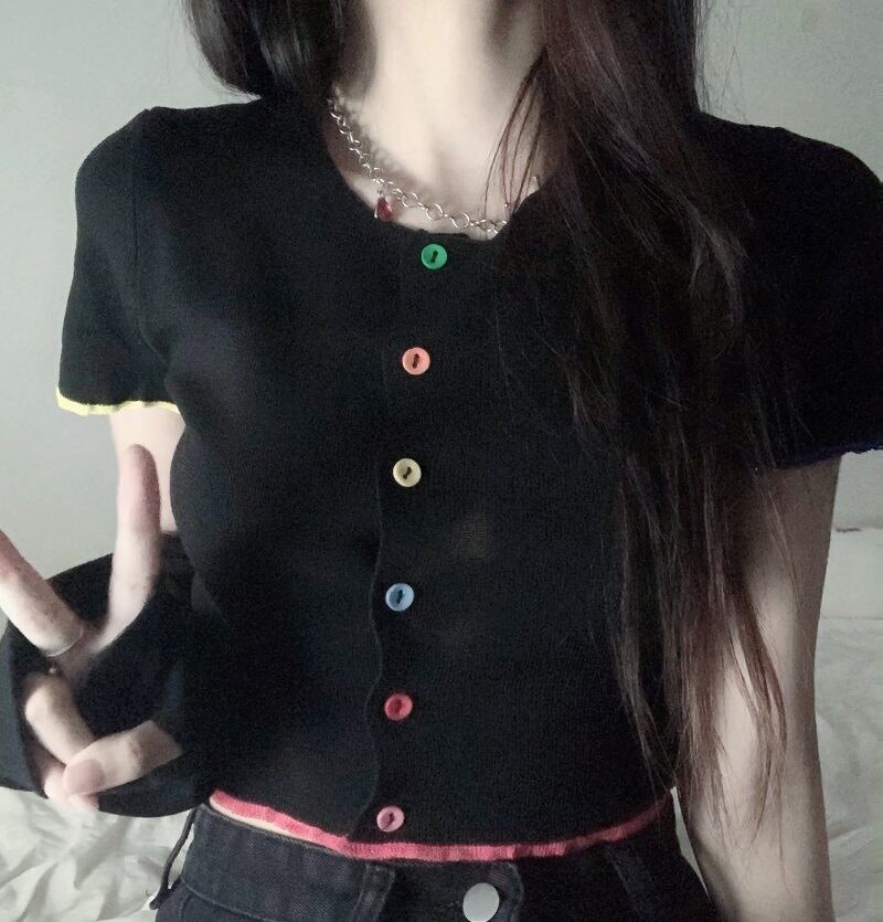 夏服韓国ファッショントレンドスタンダードカジュアルカラーボタンカーディガンニットTシャツトップス レディース レトロ 大人ガーリー スウィート キュート 夏物 スタイル Studios23229450254 | pLegLad Studios
