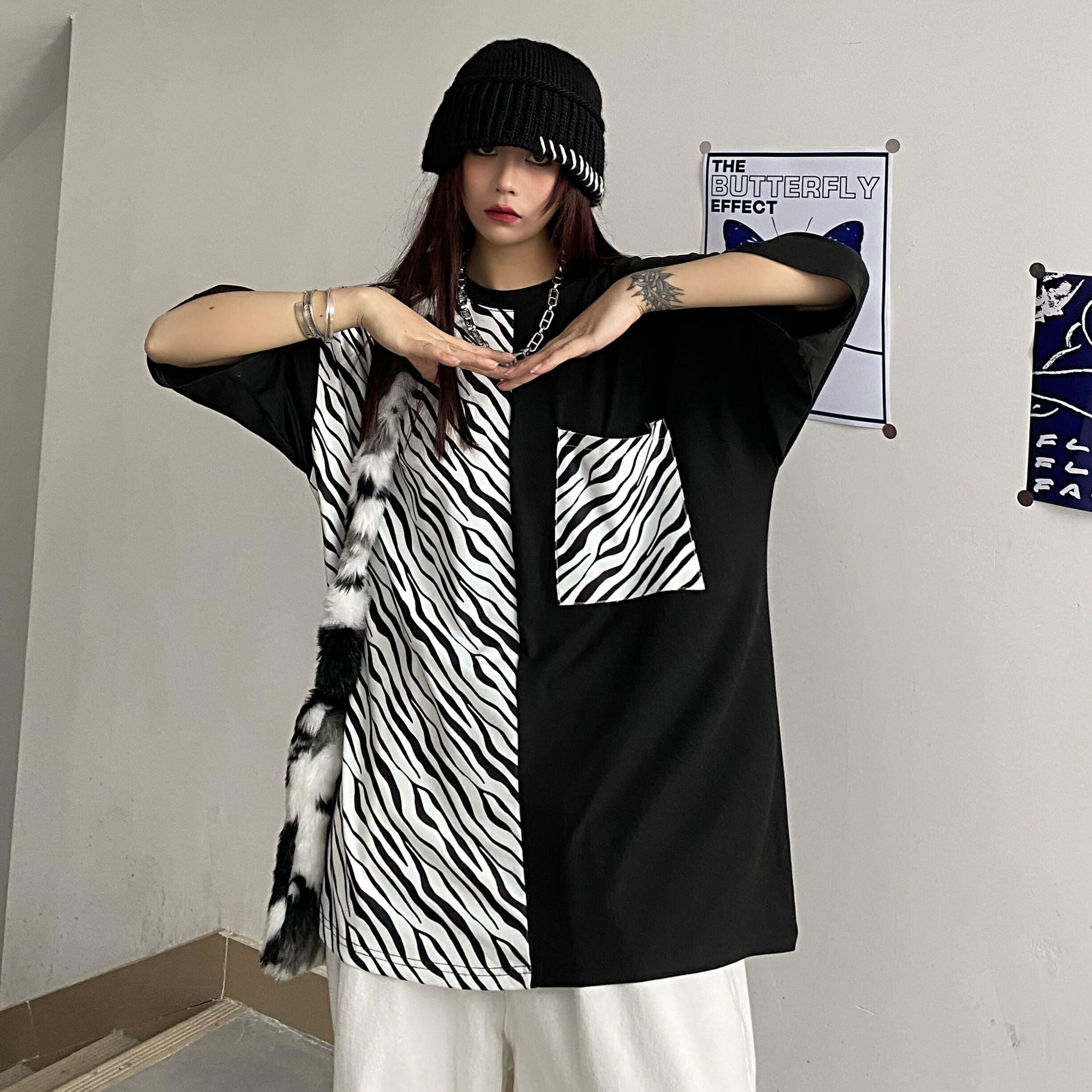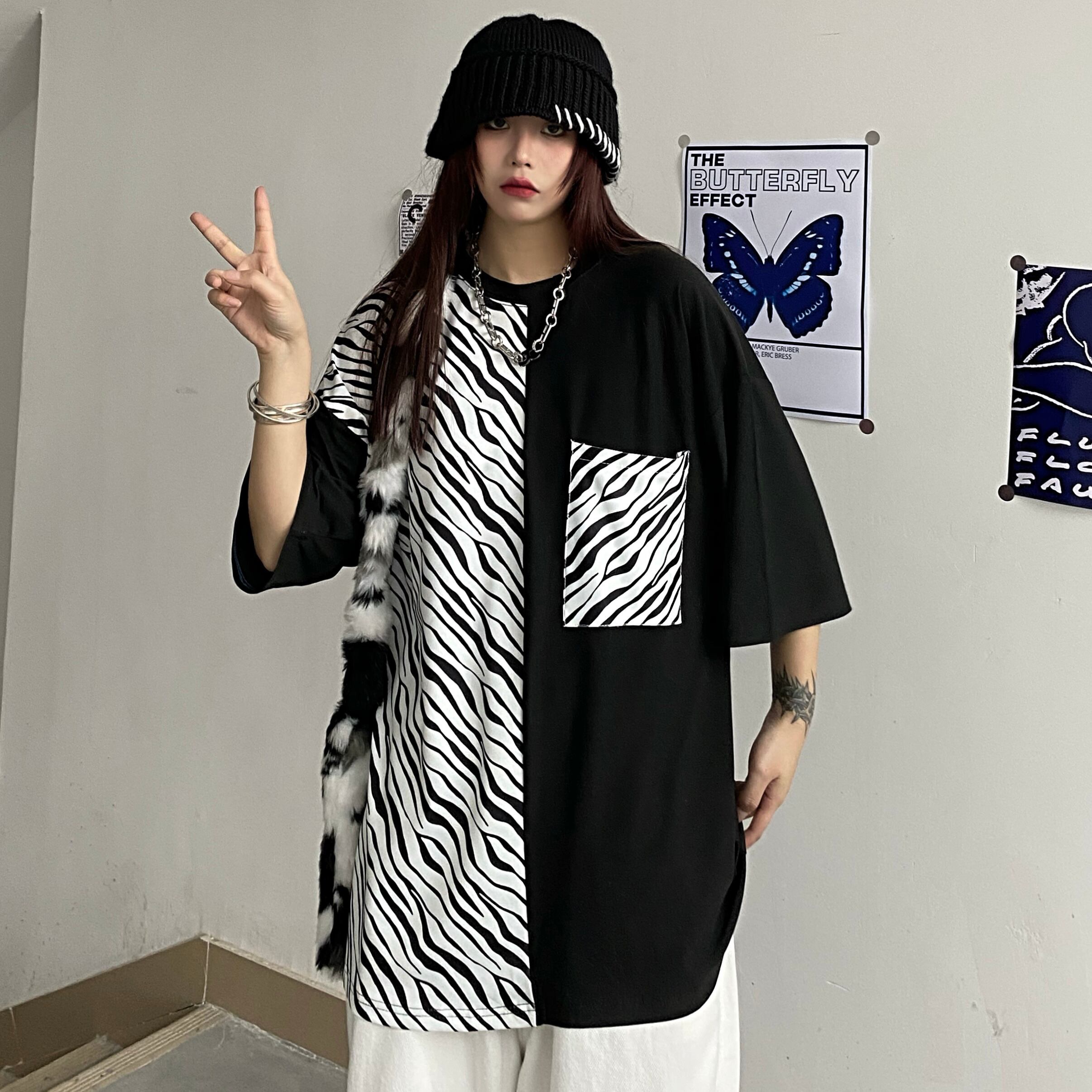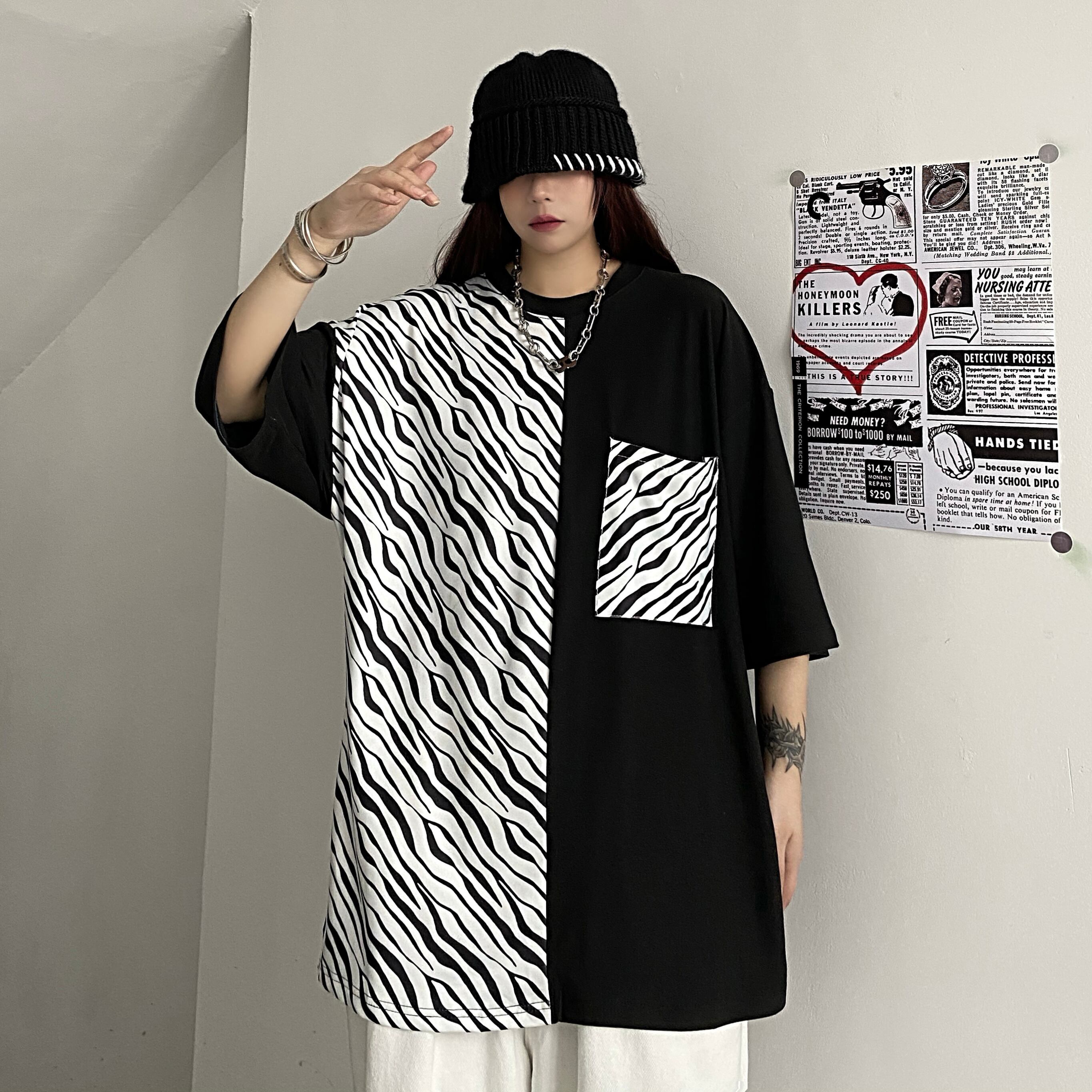 夏服韓国ファッショントレンドスタンダードブラックホワイトパターンカジュアルルーズラウンドネックTシャツレディース レトロ 夏物 Oネック ステッチ スタイル Studios24233897189 | pLegLad Studios