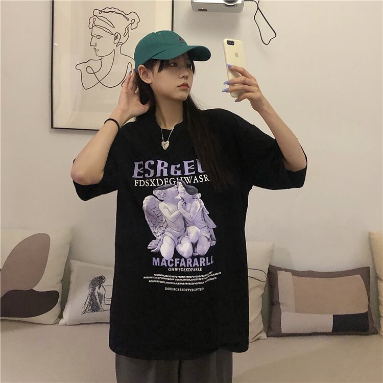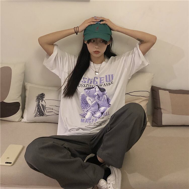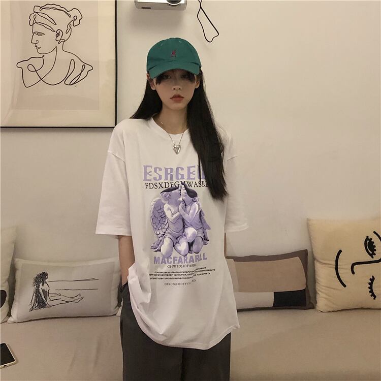 夏服韓国ファッショントレンドプリントルーズラウンドネック半袖スリーブTシャツレディース ショート ハーフスリーブ 夏物 Oネック パープル スタイル Studios50416123487 | pLegLad Studios