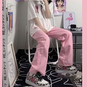 ジーンズ レディース夏服韓国ファッショントレンドルーズ薄手ハイウェストウェストワイドレッグパンツ ピンク ストリート 夏物 ワイドパンツ ボーイズ スタイル ウエスト Studios25654009749 | pLegLad Studios