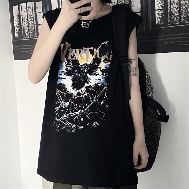 夏服ゆったりシャツ レディース韓国ファッショントレンドダークプリントルーズノースリーブTシャツ 夏物 スタイル コーデ モノクロ Studio52443858742 | pLegLad Studios