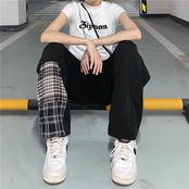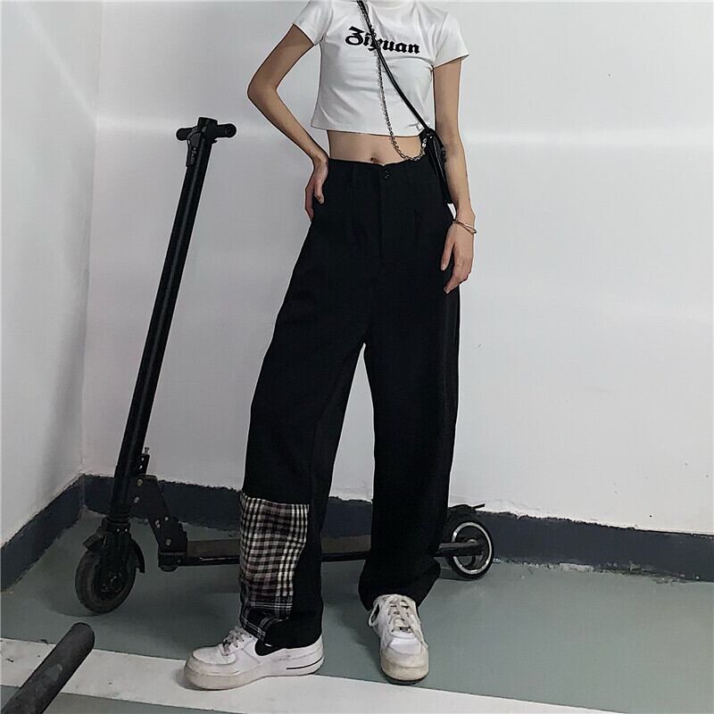 夏服ハイウェストウェストカジュアルレディース韓国ファッション薄手パンツ 格子柄 夏物 ステッチ スタイル ウエスト コーデ モノクロ Studio19973224173