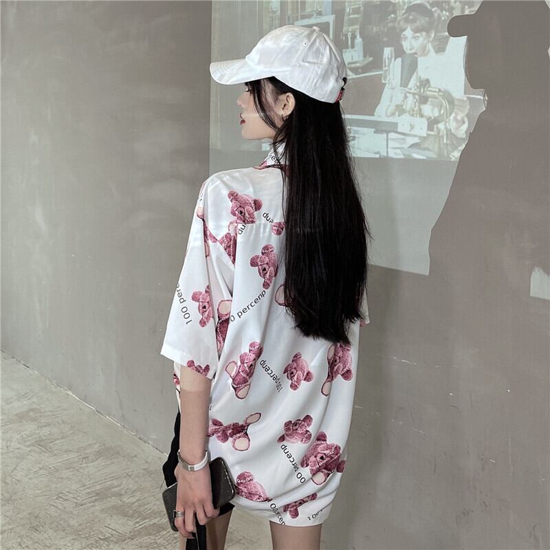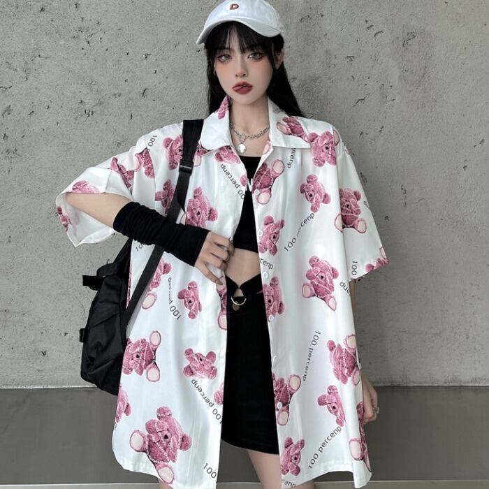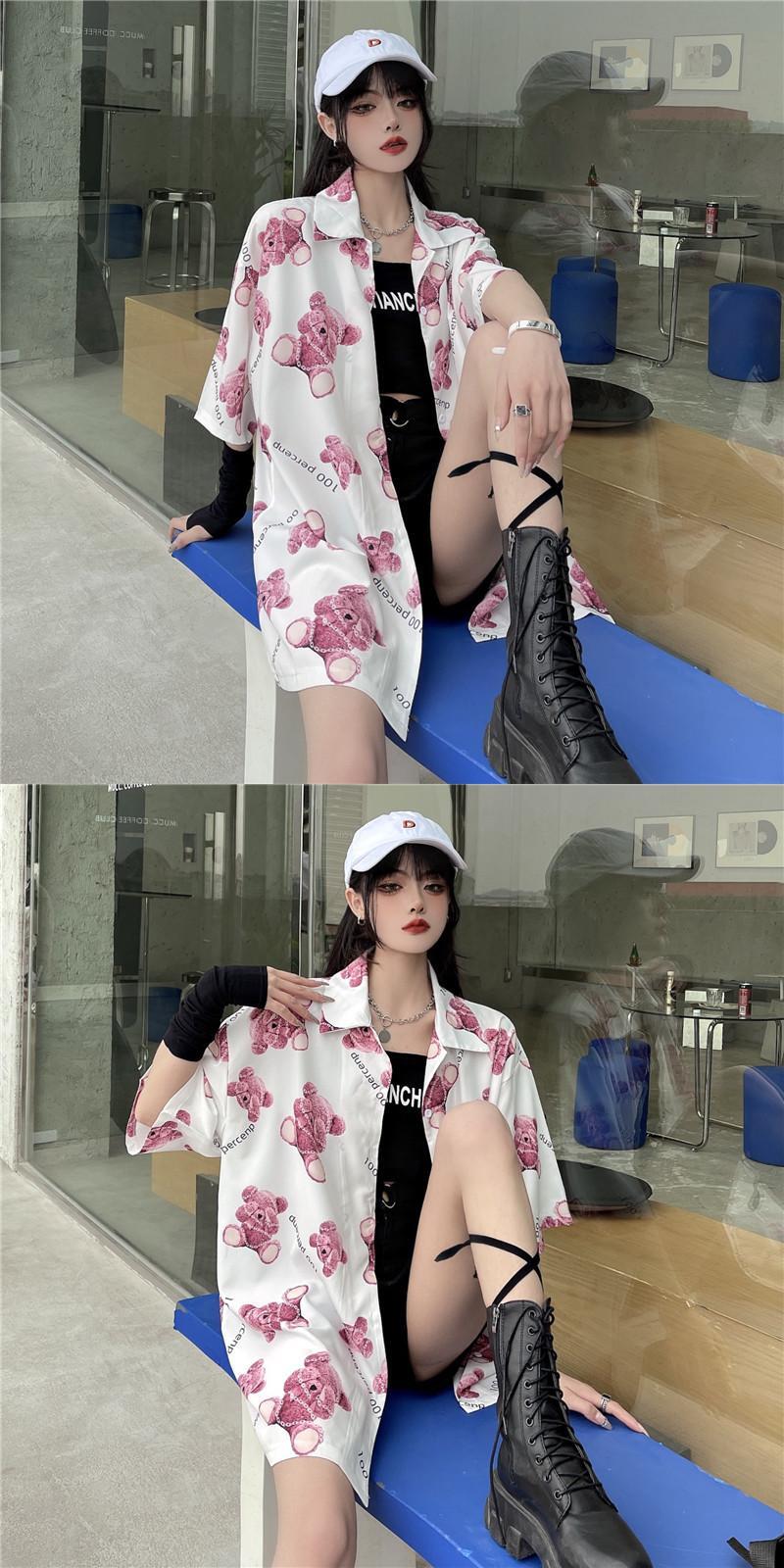 シャツ レディース夏服スタイル韓国ファッショントレンドスタンダードプリント柄ルーズカジュアルトップス レトロ 夏物 ボーイズ コーデ モノクロ Studio39727302464