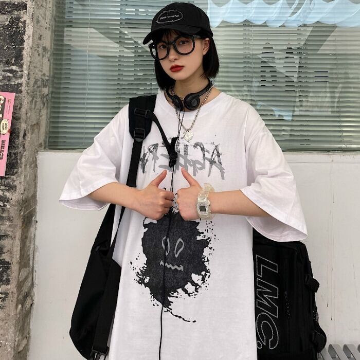 スタイルゆったりシャツ レディース夏服韓国ファッショントレンドスタンダードプリントルーズTシャツトップス レトロ 夏物 ボーイズ コーデ モノクロ Studio60998037454