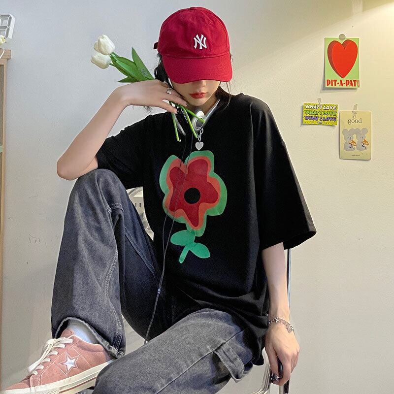 夏服Tシャツシャツ レディース韓国ファッショントレンドスタンダードFlowerデザイン ゆったりトップス レトロ 夏物 フラワーデザイン スタイル コーデ モノクロ Studio58894661607