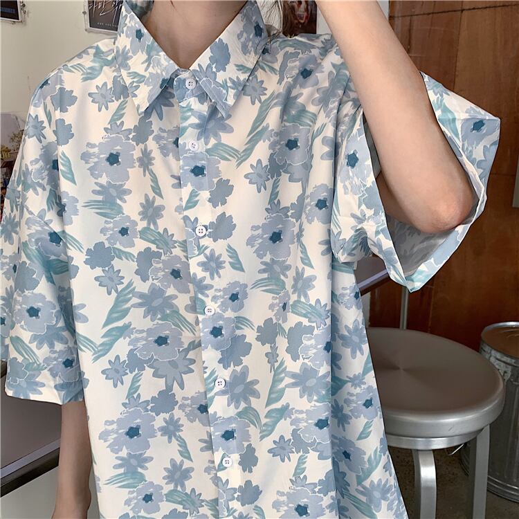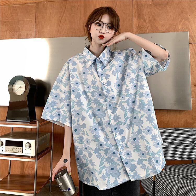 夏服シャツ レディーススタイル韓国ファッショントレンドフローラルプリント柄ルーズカジュアル 夏物 花柄 コーデ モノクロ Studio95289072173