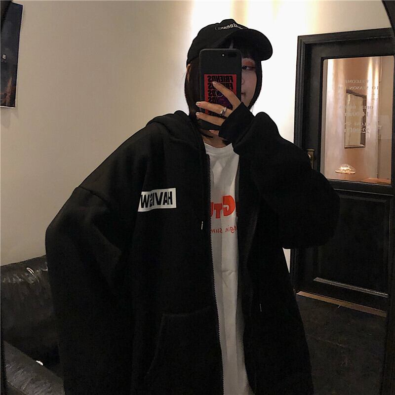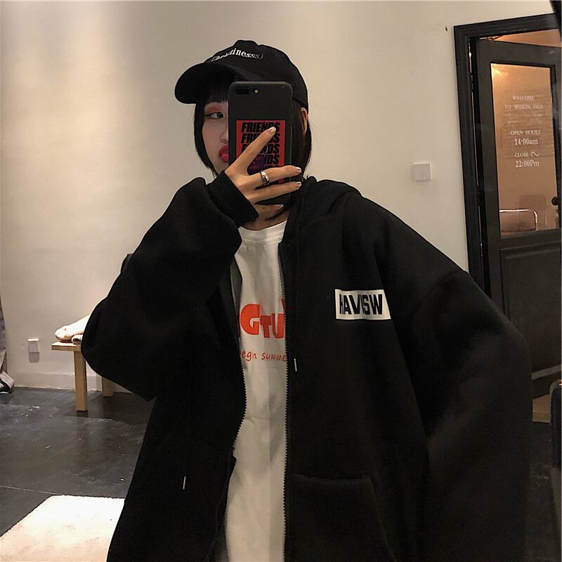 カーディガンジッパーセーター レディース秋物韓国ファッショントレンドダークルーズフードトップス ストリート オータム スタイル コーデ モノクロ Studio55001502260