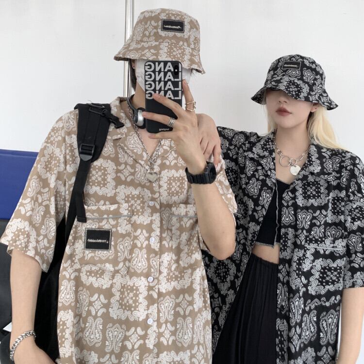 夏服韓国ファッショントレンドスタイルFlowerデザイン ストライプルーズシャツ メンズレディース ストリート 原宿 夏物 フラワーデザイン Studios79471426995 | pLegLad Studios