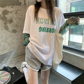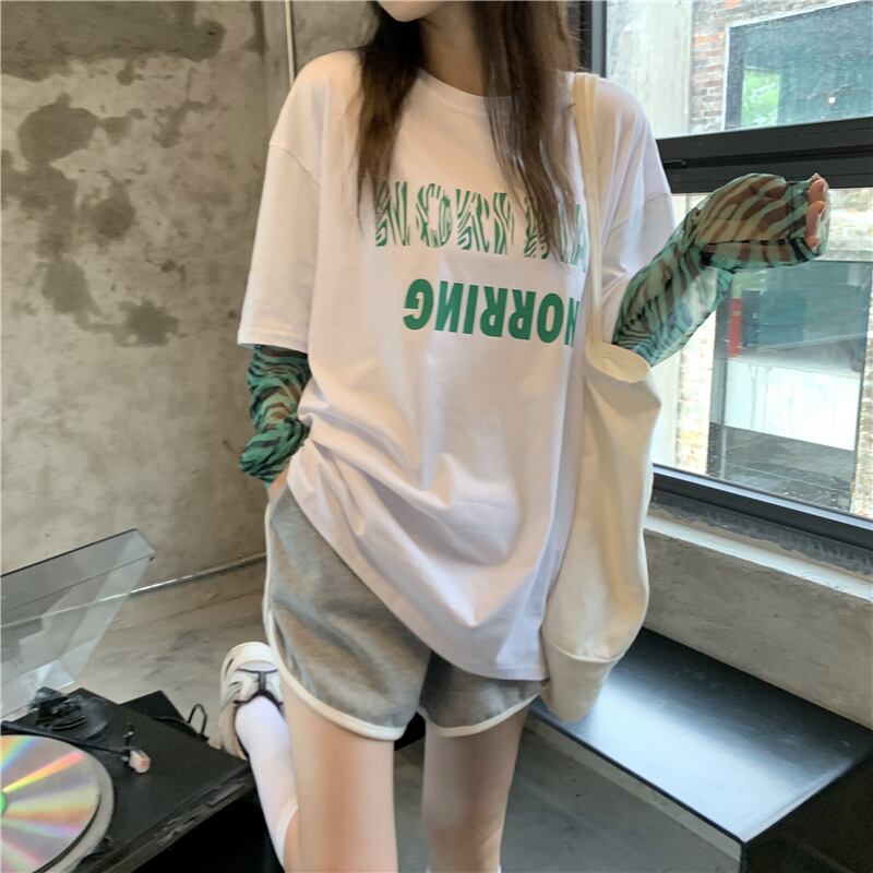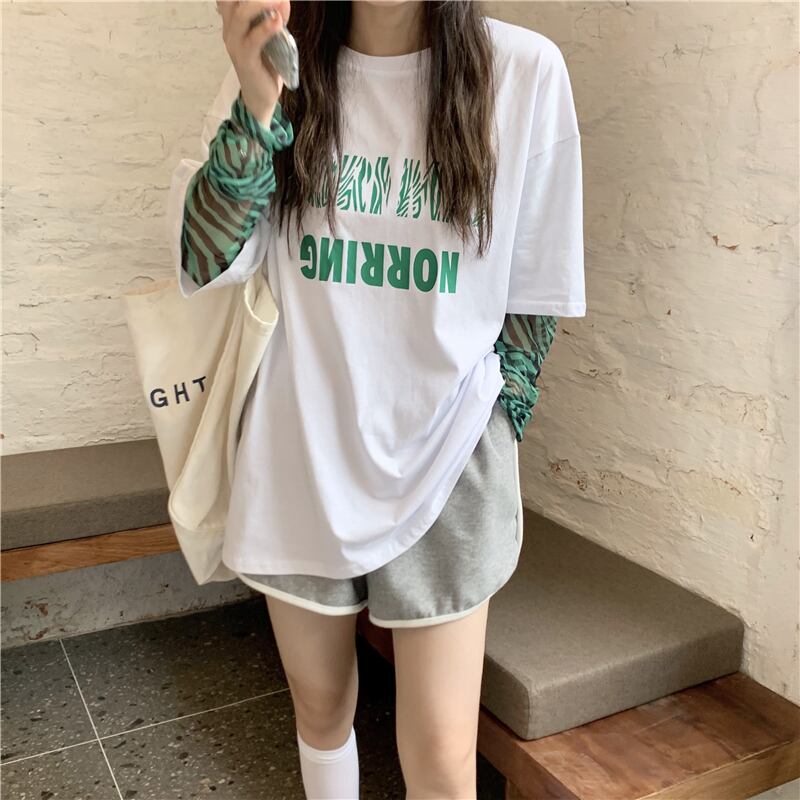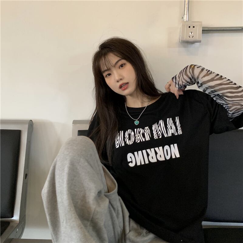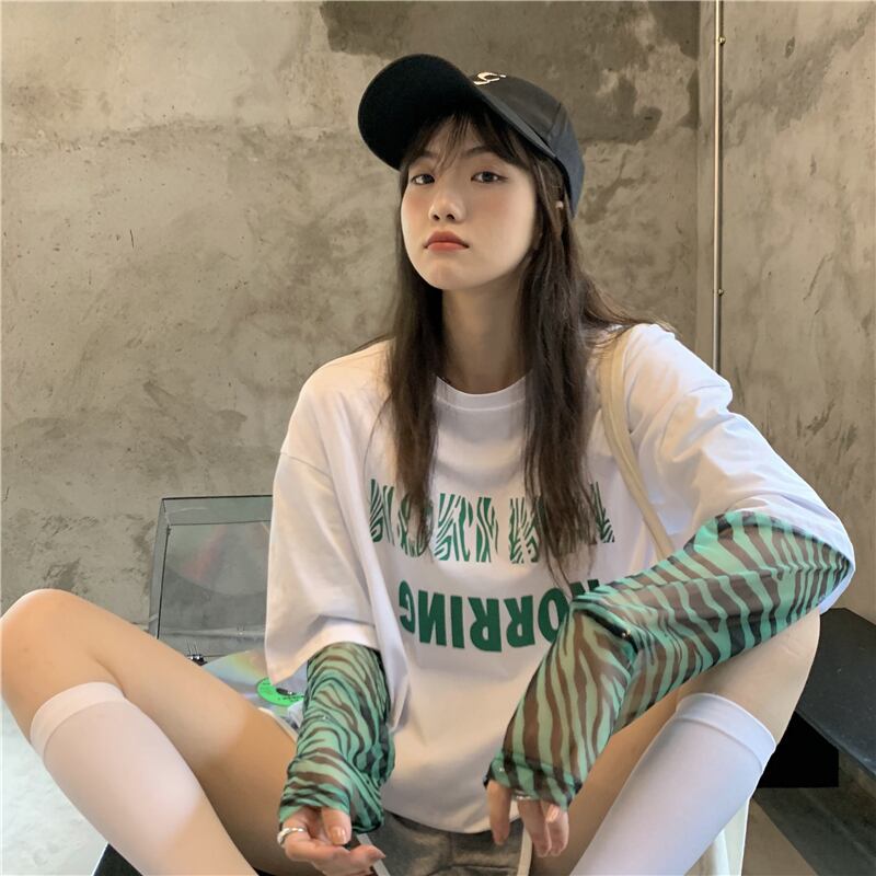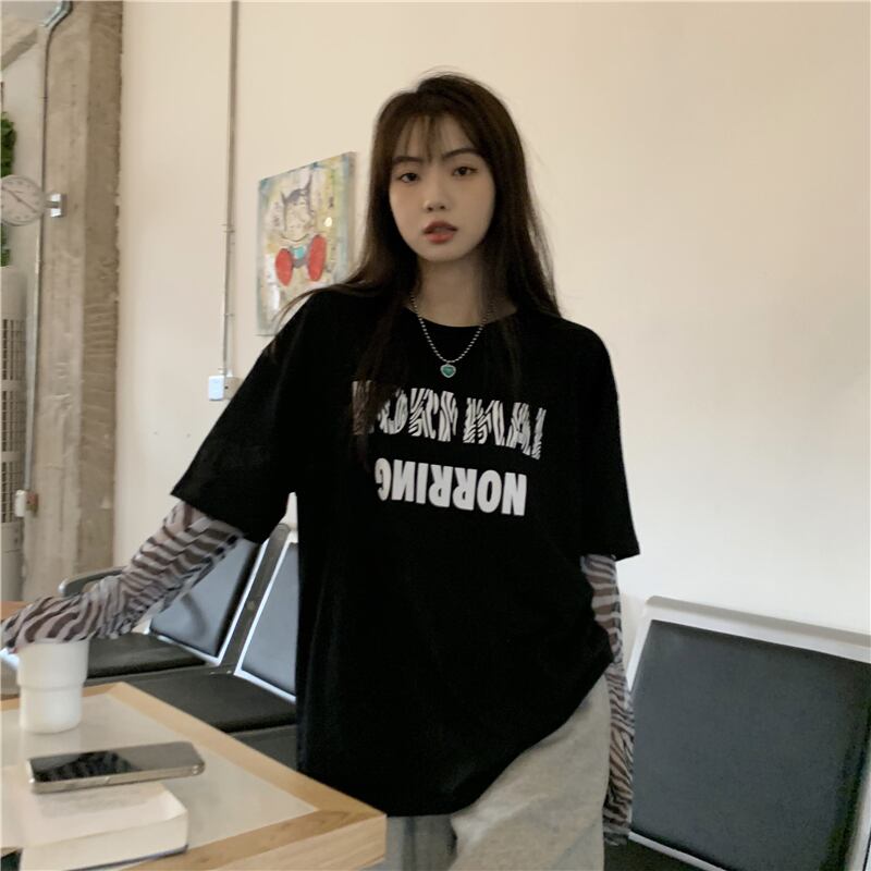 Tシャツレディース夏服韓国ファッショントレンドパターンラウンドネックルーズトップス ロング ストリート 夏物 Oネック ステッチ スタイル 長袖 Studios70495937819 | pLegLad Studios