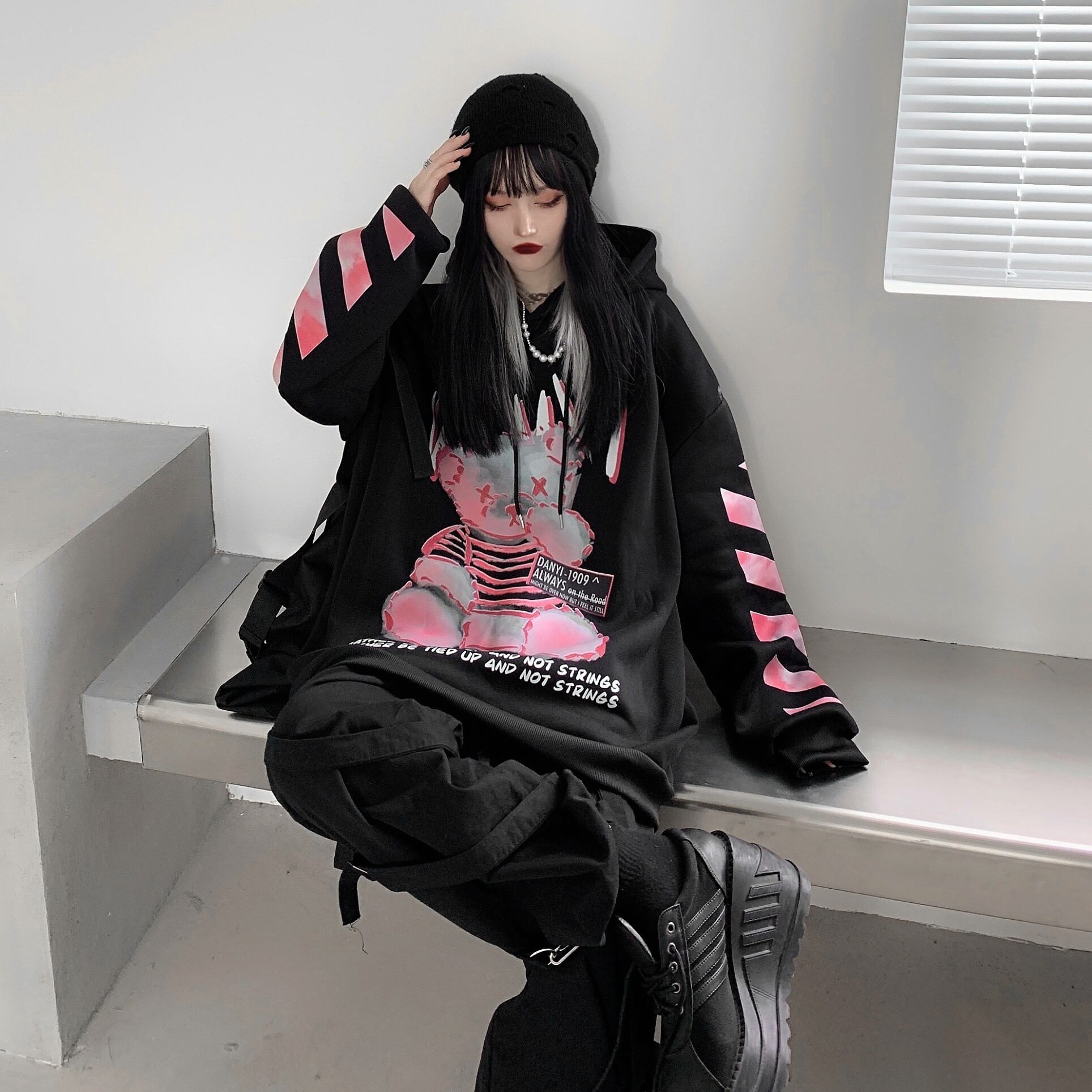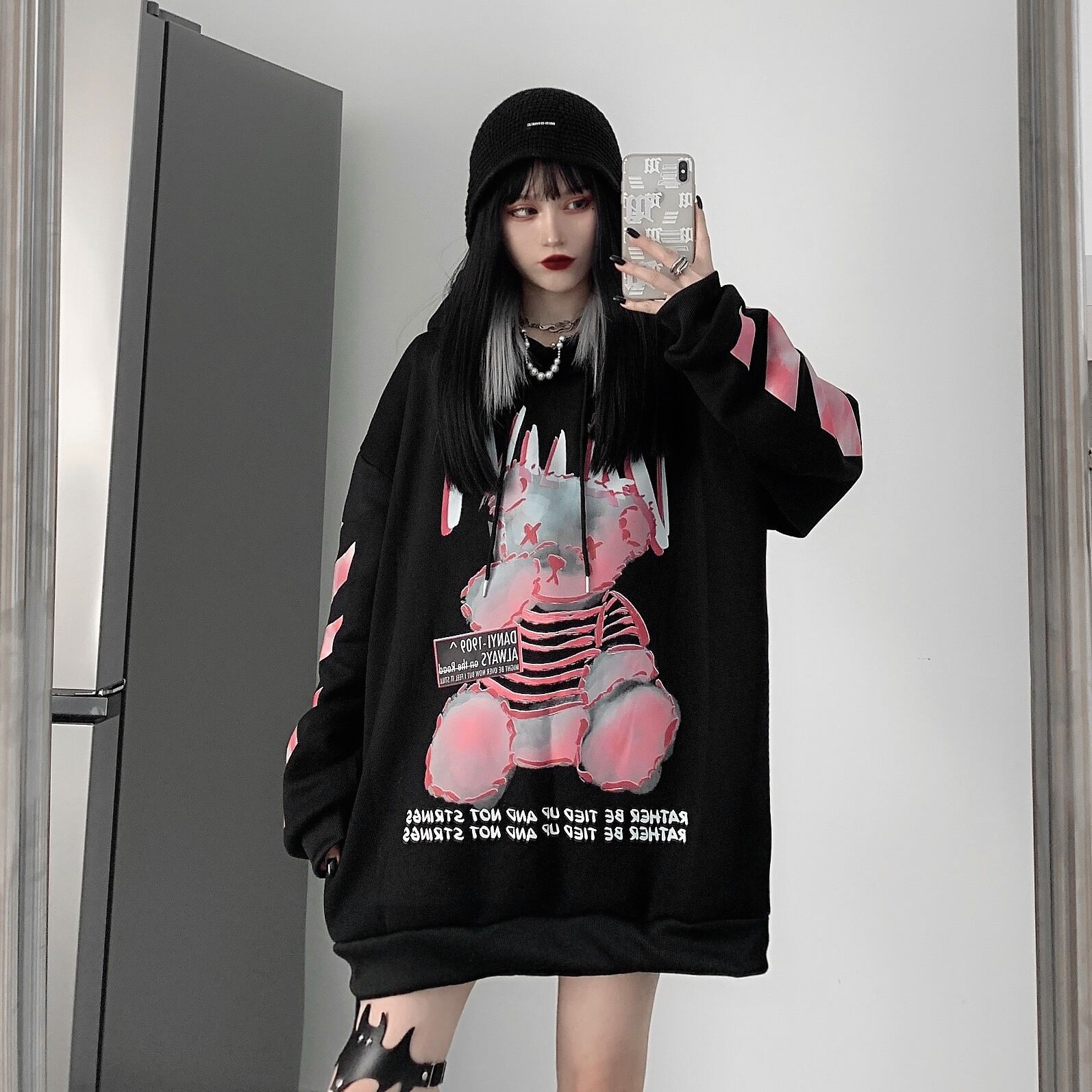 薄手セーター レディース韓国ファッションプリント柄ルーズフードトップス コート ロング ボーイズ スタイル 長袖 コーデ モノクロ Studio39081191072