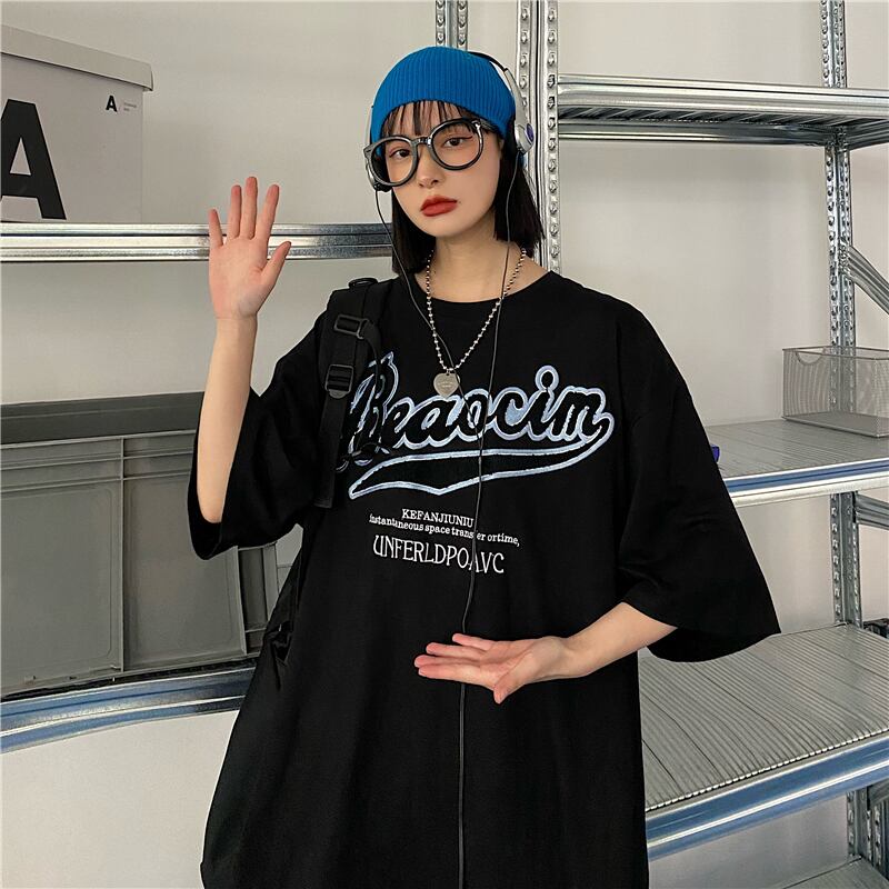 スタンダードTシャツレディース夏服韓国ファッショントレンド刺繍プリントルーズトップス レトロ 夏物 スタイル コーデ モノクロ Studio82809664507