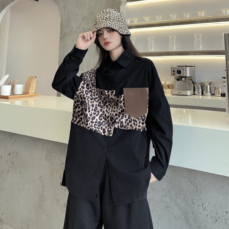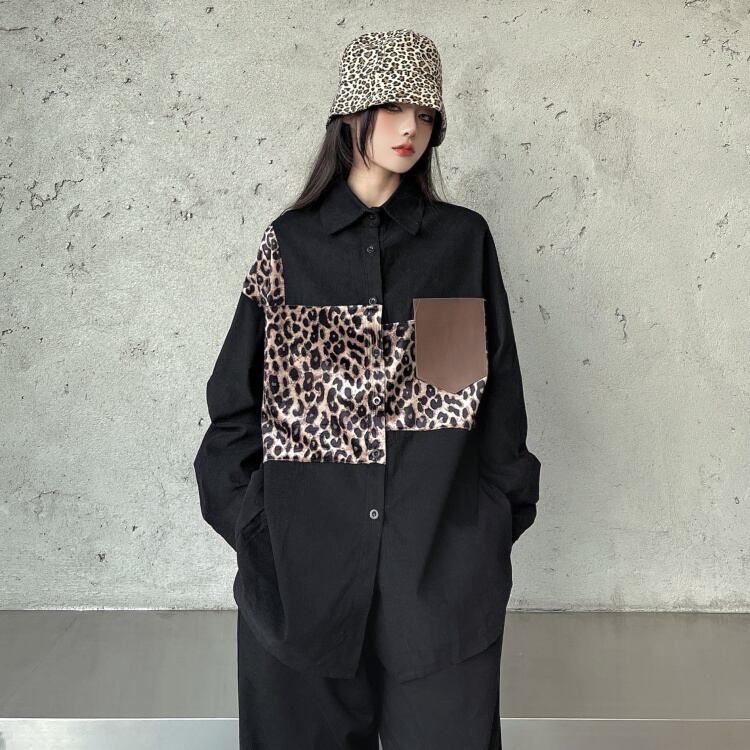 秋物ロングシャツ レディース韓国ファッショントレンドレオパードパターンルーズ オータム ステッチ ボーイズ スタイル 長袖 コーデ モノクロ Studio79393641934