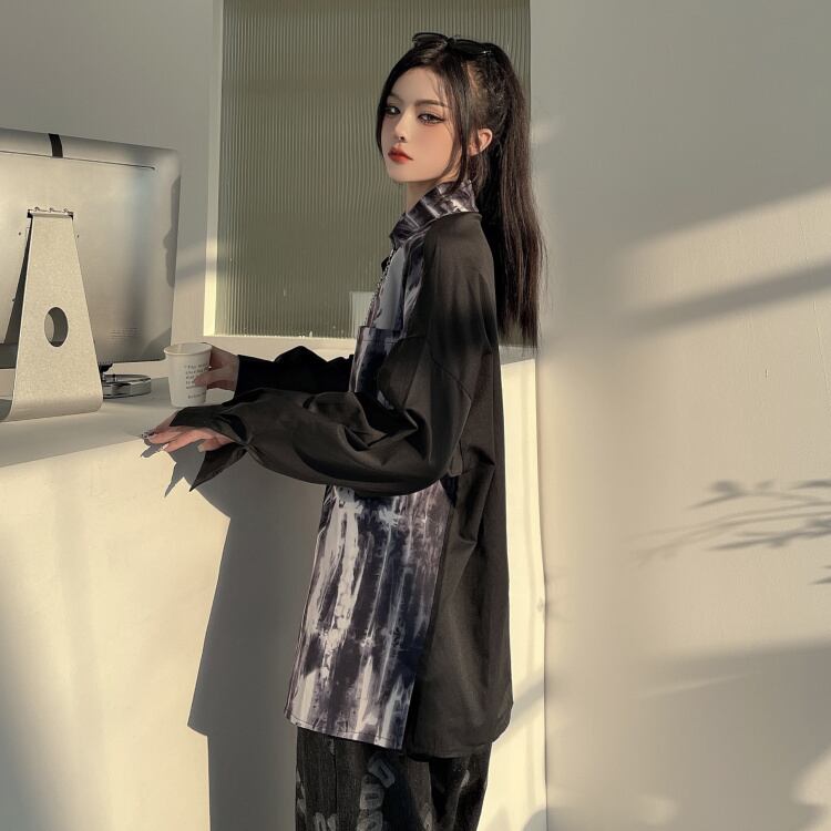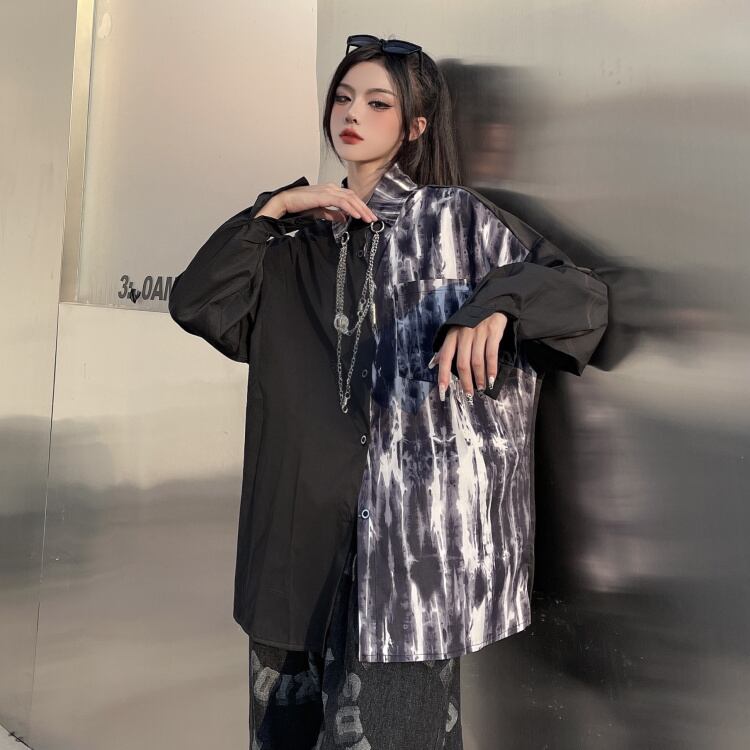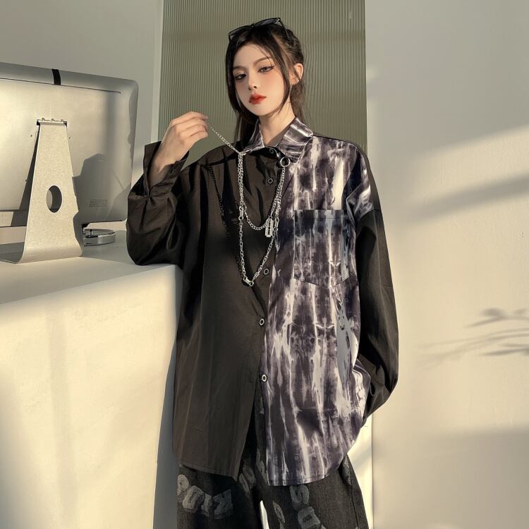 ダークシャツ レディース夏服韓国ファッショントレンドチェーン ルーズ ロング 夏物 ボーイズ スタイル 長袖 コーデ モノクロ Studio18882892241