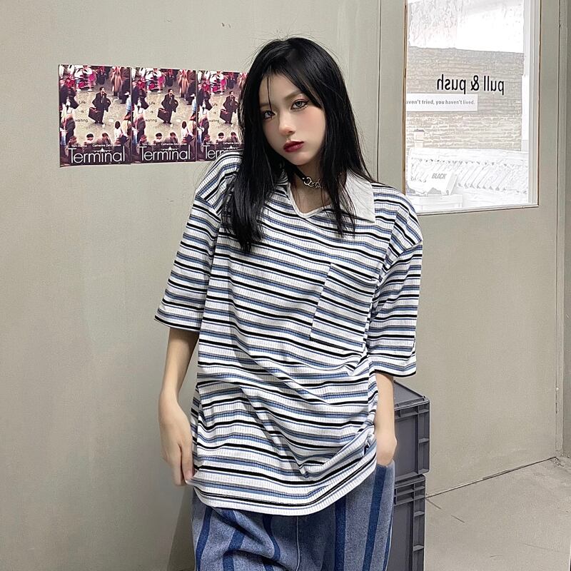 ストライプカジュアルTシャツシャツ レディース夏服韓国ファッショントレンドカラールーズゆったり 夏物 スタイル コーデ モノクロ Studio80310023863