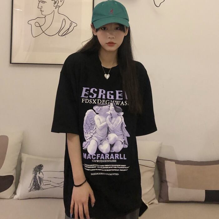 ルーズTシャツレディース夏服韓国ファッショントレンドスタンダードプリント柄ラウンドネックトップス レトロ 夏物 Oネック スタイル コーデ モノクロ Studio94752247974 | pLegLad Studios